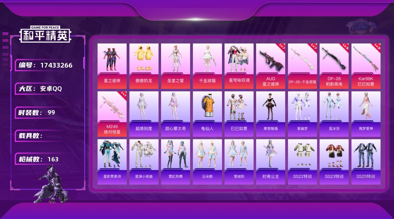 [17433266]安卓 手Q-6粉装-7特效枪-0载具-2粉色飞行器-44491热力值-2王牌印记-99套装-163枪皮 【热门品类】:套装-龟仙人 【粉色套装】:粉装-星之彼岸,粉装-傲傲奶龙,角色-圣堂之誓,角色-千金淑猫,粉装-星穹咏叹调,角色-虹云熊熊 【粉色枪皮等级】:AUG-星之彼岸(七级),UMP45-萌骑冒险(四级),Kar98K-巳巳如意(五级),Mk14-福马献瑞(五级),M249-绝对恒星(一级),DP-28-千金淑猫(七级),DP-28-豹影疾电(五级) 【粉色枪皮】:AUG-星之彼岸,UMP45-萌骑冒险,Kar98K-巳巳如意,Mk14-福马献瑞,M249-绝对恒星,DP-28-千金淑猫,DP-28-豹影疾电 【粉色飞行器】:炫彩糖果飞行器,星之彼岸飞行器 【粉色降落伞】:绝对恒星降落伞,星之彼岸降落伞,闲梦青缨降落伞,圣堂之誓降落伞,千金淑猫降落伞,智耀战神降落伞,星穹咏叹调降落伞,幻彩电音降落伞,绯穹魔姬降落伞,炫彩糖果降落伞,霁蓝缠春降落伞,罪夜之冕降落伞 【稀有套装】:套装-龟仙人,套装-巳巳如意,角色-超感刻度,角色-甜心蒙太奇,套装-雪国风尚,套装-炫彩糖果,套装-马上有钱,角色-摩登魅猫,套装-紫幽梦,套装-蓝冰羽,角色-瑰梦爱神,套装-星影赞美诗,套装-星渊小夜曲,套装-霓虹热舞,套装-云朵鹅,套装-雪绒豹,角色-时希公主,角色-馥郁金蕊,角色-孙斩天 【稀有枪皮】:AUG-冰晶雪宝,AKM-星之彼岸,AKM-江南烟雨,AKM-破晓战魂,AKM-龙的传人,M16A4-红色方程式,SCAR-L-炫彩节奏,SCAR-L-红色方程式,M416-糯团青竹,M416-红色方程式,M416-蓝色火焰,AUG-耀粉歌者,AUG-绝对恒星,M762-天降萌叽,M762-彩虹符号,M762-萌物绒绒,M762-云朵鹅,AC-VAL-快闪甜心,AC-VAL-闲梦青缨,蜜獾-天降萌叽,UZI-啾咪啾咪,UZI-天降萌叽,UZI-红色方程式,UMP45-生命誓言,UMP45-绒宝小鹅,Vector-焰鹰斗篷,Vector-音爆索尼克,汤姆逊-炫彩节奏,汤姆逊-耀粉歌者,P90-快闪甜心,P90-巳巳如意,Kar98K-彩虹符号,Kar98K-星穹咏叹调,M24-幻彩电音,M24-樱桃泡泡,AWM-焰鹰斗篷,AWM-圣堂之誓,VSS-星之彼岸,Win94-星兔领航