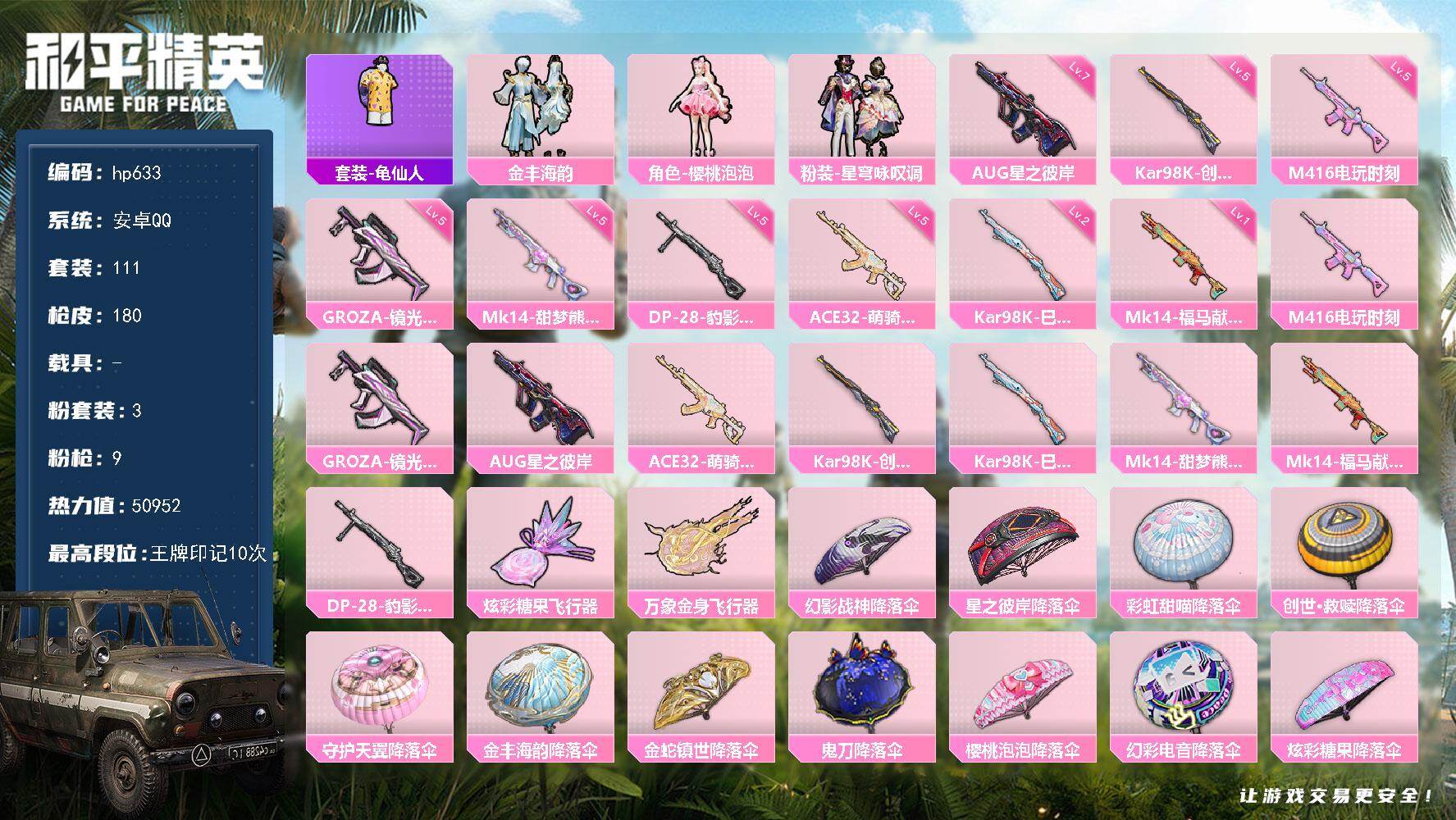 [17433670]安卓 手Q-3粉装-9特效枪-0载具-2粉色飞行器-50952热力值-10王牌印记-111套装-180枪皮