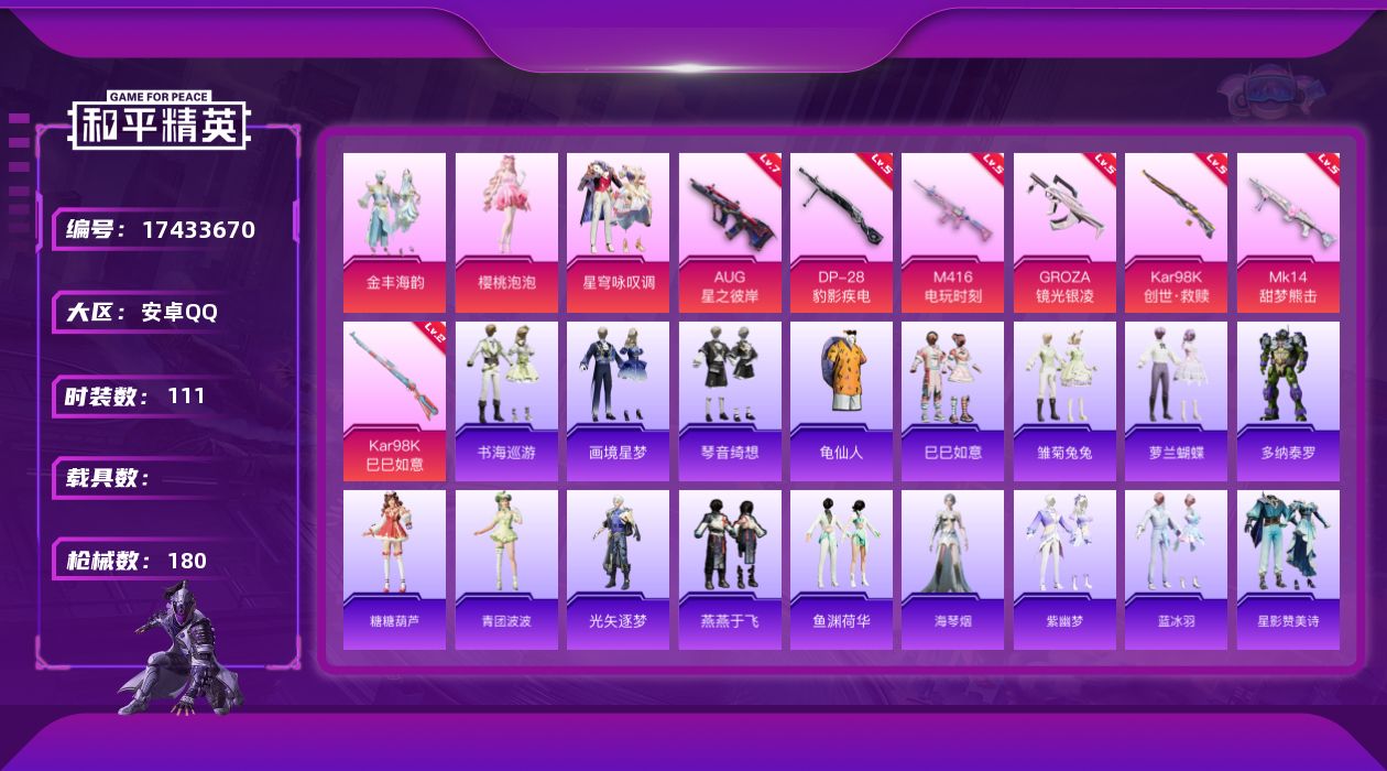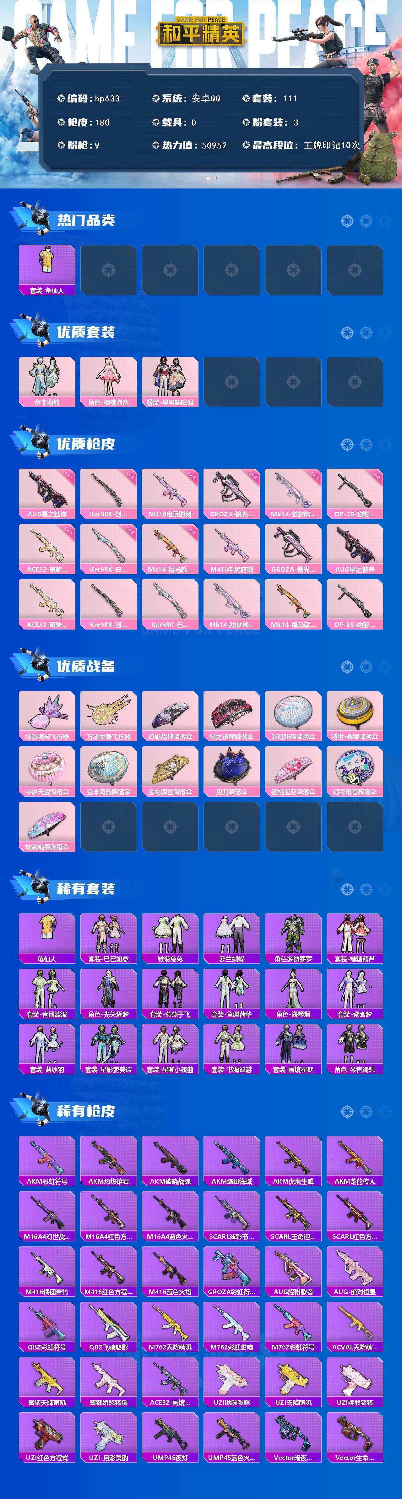 [17433670]安卓 手Q-3粉装-9特效枪-0载具-2粉色飞行器-50952热力值-10王牌印记-111套装-180枪皮 【热门品类】:套装-龟仙人 【粉色套装】:粉装-金丰海韵,角色-樱桃泡泡,粉装-星穹咏叹调 【粉色枪皮等级】:M416-电玩时刻(五级),GROZA-镜光银凌(五级),AUG-星之彼岸(七级),ACE32-萌骑漫游(五级),Kar98K-创世·救赎(五级),Kar98K-巳巳如意(二级),Mk14-甜梦熊击(五级),Mk14-福马献瑞(一级),DP-28-豹影疾电(五级) 【粉色枪皮】:M416-电玩时刻,GROZA-镜光银凌,AUG-星之彼岸,ACE32-萌骑漫游,Kar98K-创世·救赎,Kar98K-巳巳如意,Mk14-甜梦熊击,Mk14-福马献瑞,DP-28-豹影疾电 【粉色飞行器】:炫彩糖果飞行器,万象金身飞行器 【粉色降落伞】:幻影战神降落伞,星之彼岸降落伞,彩虹甜喵降落伞,创世·救赎降落伞,守护天翼降落伞,金丰海韵降落伞,金蛇镇世降落伞,鬼刀降落伞,樱桃泡泡降落伞,幻彩电音降落伞,炫彩糖果降落伞 【稀有套装】:套装-龟仙人,套装-巳巳如意,套装-雪国风尚,套装-炫彩糖果,套装-雏菊兔兔,套装-萝兰蝴蝶,角色-多纳泰罗,套装-糖糖葫芦,套装-青团波波,角色-光矢逐梦,套装-燕燕于飞,套装-鱼渊荷华,角色-海琴烟,套装-紫幽梦,套装-蓝冰羽,套装-星影赞美诗,套装-星渊小夜曲,套装-书海巡游,套装-画境星梦,套装-琴音绮想 【稀有枪皮】:AUG-冰晶雪宝,AKM-彩虹符号,AKM-灼热熔岩,AKM-破晓战魂,AKM-缤纷海域,AKM-虎虎生威,AKM-龙的传人,M16A4-幻世战舞者,M16A4-红色方程式,M16A4-蓝色火焰,SCAR-L-炫彩节奏,SCAR-L-玉兔迎春,SCAR-L-红色方程式,M416-糯团青竹,M416-红色方程式,M416-蓝色火焰,GROZA-彩虹符号,AUG-耀粉歌者,AUG-绝对恒星,QBZ-彩虹符号,QBZ-飞驰魅影,M762-天降萌叽,M762-彩虹甜喵,M762-彩虹符号,AC-VAL-天降萌叽,蜜獾-天降萌叽,蜜獾-娇憨猪猪,ACE32-画境星梦,UZI-啾咪啾咪,UZI-天降萌叽,UZI-娇憨猪猪,UZI-红色方程式,UZI-月影灵韵,UMP45-夜灯,UMP45-蓝色火焰,Vector-暗夜玫瑰,Ve