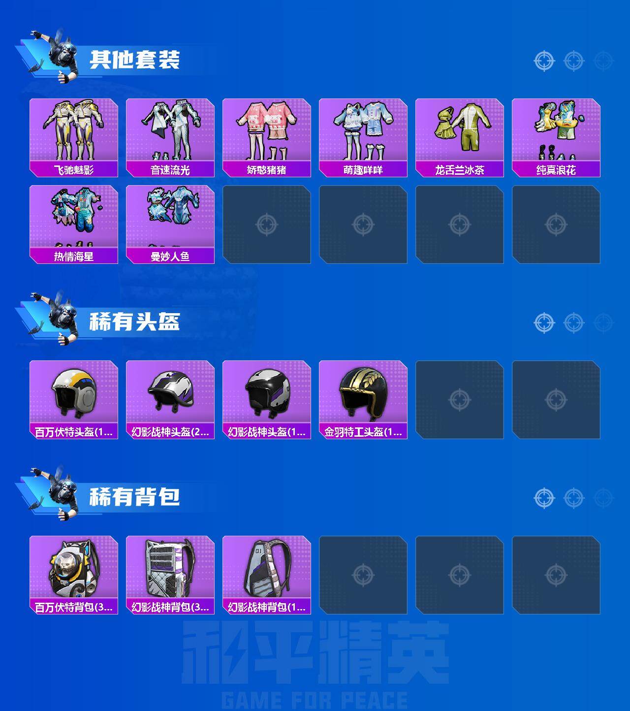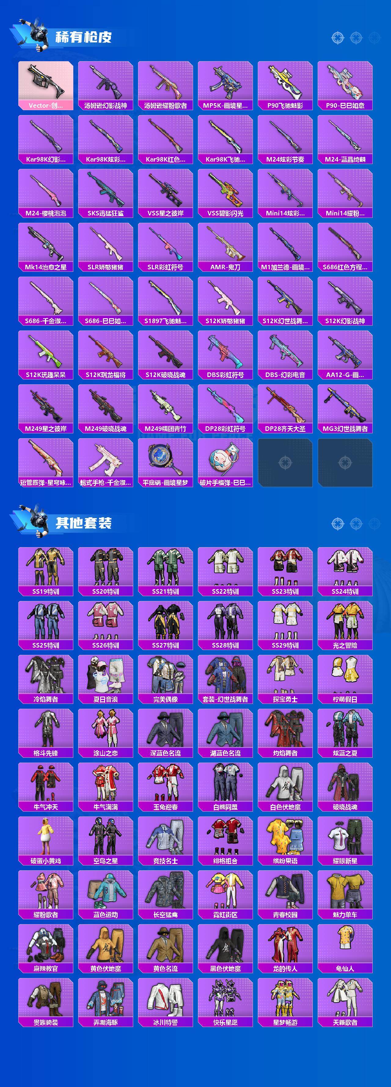 【稀有枪皮】:AUG-冰晶雪宝,AKM-彩虹符号,AKM-灼热熔岩,AKM-破晓战魂,AKM-缤纷海域,AKM-虎虎生威,AKM-龙的传人,M16A4-幻世战舞者,M16A4-红色方程式,M16A4-蓝色火焰,SCAR-L-炫彩节奏,SCAR-L-玉兔迎春,SCAR-L-红色方程式,M416-糯团青竹,M416-红色方程式,M416-蓝色火焰,GROZA-彩虹符号,AUG-耀粉歌者,AUG-绝对恒星,QBZ-彩虹符号,QBZ-飞驰魅影,M762-天降萌叽,M762-彩虹甜喵,M762-彩虹符号,AC-VAL-天降萌叽,蜜獾-天降萌叽,蜜獾-娇憨猪猪,ACE32-画境星梦,UZI-啾咪啾咪,UZI-天降萌叽,UZI-娇憨猪猪,UZI-红色方程式,UZI-月影灵韵,UMP45-夜灯,UMP45-蓝色火焰,Vector-暗夜玫瑰,Ve