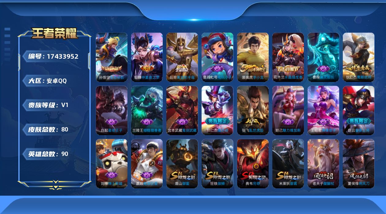 - [15295582]【店主推荐捡漏号!可直接换绑】安卓Q-V8-荣耀黄金I段位-125英雄-241皮肤-1典藏皮肤-13传说-68史诗 【荣耀典藏】:李白鸣剑曳影 【传说皮肤】:桑启鸣野蒿,李白诗剑行,公孙离祈雪灵祝,诸葛亮时雨天司,虞姬启明星使,孙悟空零号赤焰,李信一念神魔,干将莫邪久胜战神,百里玄策白虎志,花木兰冠军飞将,后羿黄金射手座,李白凤求凰,孙尚香末日机甲 【限定皮肤】:白起狰,狄仁杰阴阳师,虞姬凯尔特女王,赵云皇家上将,墨子神迹守卫,嬴政优雅恋人,嬴政白昼王子,鲁班七号狮舞东方,庄周高山流水,高渐离死亡摇滚,钟无艳王者之锤,孙膑妖精王,扁鹊炼金王,芈月重明,吕布猎兽之王,元歌云间偶戏,元歌无心,甄姬游园惊梦,曹操烛龙,典韦穷奇,典韦蓝屏警告,狄仁杰魔术师,狄仁杰万华元夜,达摩沙漠行僧,项羽海滩派对,老夫子醍醐杖,老夫子航海奇遇记,关羽冰锋战神,程咬金演武夺筹,露娜一生所爱,韩信逐梦之影,韩信傲雪梅枪,兰陵王金庭之子,花木兰青春决赛季,花木兰瑞麟志,花木兰默契交锋,亚瑟潮玩骑士王,孙悟空至尊宝,孙悟空大圣娶亲,孙悟空零号赤焰,牛魔御旌,李元芳云中旅人,虞姬霸王别姬,虞姬启明星使,钟馗神迹守卫,钟馗驱傩正仪,杨玉环遇见飞天,女娲朔望之晖,干将莫邪冰霜恋舞曲,雅典娜单词大作战,雅典娜黎明之约,蔡文姬繁星吟游,太乙真人饕餮,鬼谷子原初探秘者,诸葛亮时雨天司,铠青龙志,苏烈千军破阵,百里玄策白虎志,百里玄策原初追逐者,弈星混沌棋,梦奇顽趣,公孙离祈雪灵祝,沈梦溪大漠名商,明世隐疑决卦,裴擒虎李小龙,裴擒虎擒涛扼浪,狂铁御狮,米莱狄御霄,云中君纤云弄巧,盾山御銮,上官婉儿梁祝,上官婉儿天狼绘梦者,嫦娥拒霜思,蒙犽狂想玩偶喵,鲁班大师探海日志,桑启海盐诗旅,张良古海寻踪,鬼谷子天穹祈灯 【年限皮肤】:百里玄策白虎志,花木兰瑞麟志,铠青龙志,李白凤求凰,公孙离祈雪灵祝,诸葛亮时雨天司,马超神威 【赛季限定】:孙膑妖精王,扁鹊炼金王,白起狰,芈月重明,曹操烛龙,典韦穷奇,狄仁杰万华元夜,达摩沙漠行僧,老夫子醍醐杖,程咬金演武夺筹,兰陵王金庭之子,张良古海寻踪,牛魔御旌,李元芳云中旅人,虞姬凯尔特女王,钟馗驱傩正仪,雅典娜黎明之约,太乙真人饕餮,鬼谷子原初探秘者,苏烈千军破阵,百里玄策原初追逐者,弈星混沌棋,梦奇顽趣,沈梦溪大漠名商,明世隐疑决卦,裴擒虎擒涛扼浪,狂铁御狮,米莱狄御霄,盾山