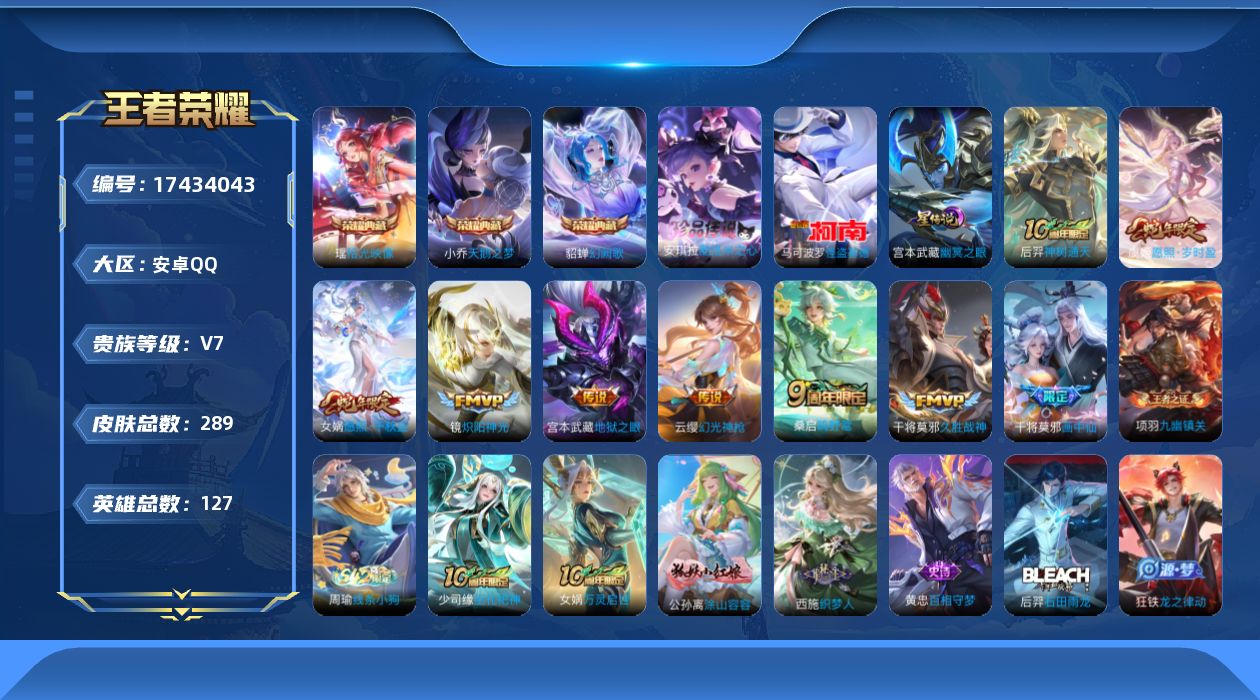 [17434043]可二次【特价出售/店主推荐】:安卓Q-V7-最强王者段位-127英雄-289皮肤-3典藏皮肤-2珍品传说-1星传说-9传说-81史诗