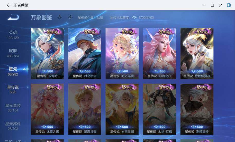 盾山御銮,夏侯惇朔风刀,明世隐疑决卦,老夫子醍醐杖,鬼谷子原初探秘者,狄仁杰万华元夜,程咬金演武夺筹,钟馗驱傩正仪,苏烈千军破阵,吕布猎兽之王,女娲朔望之晖,钟馗神迹守卫,鲁班七号狮舞东方,沈梦溪星空之诺,李元芳银河之约,刘邦夺宝奇兵,马可波罗暗影游猎,蒙犽狂想玩偶喵,元歌云间偶戏,弈星混沌棋,达摩沙漠行僧,兰陵王金庭之子,沈梦溪大漠名商,李元芳云中旅人,桑启海盐诗旅,裴擒虎擒涛扼浪,鲁班大师探海日志,张良古海寻踪,项羽苍威无极,镜青焰无极