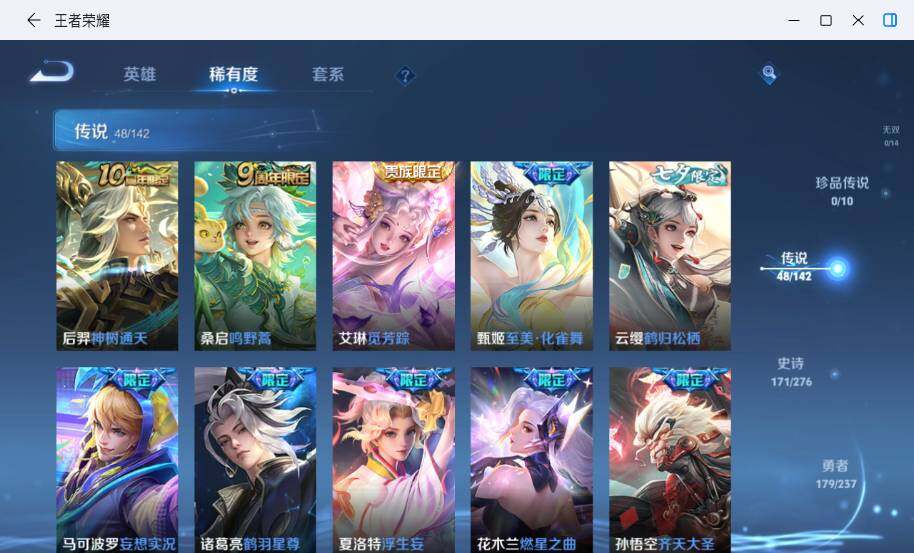 【传说皮肤】:后羿神树通天,桑启鸣野蒿,艾琳觅芳踪,甄姬至美化雀舞,云缨鹤归松栖,马可波罗妄想实况,诸葛亮鹤羽星尊,夏洛特浮生妄,花木兰燃星之曲,孙悟空齐天大圣,小乔山海琳琅生,曜山海苍雷引,李信山海炽霜斩,李白诗剑行,橘右京枫霜尽,娜可露露前尘镜,孙尚香音你闪耀,马可波罗深海之息,马超无双飞将,大乔挚爱花嫁,孙策挚爱之约,露娜启示之音,瑶时之祈愿,裴擒虎寅虎赤拳,孙尚香异界灵契,曜李逍遥 ,兰陵王默契交锋,公孙离祈雪灵祝,诸葛亮时雨天司,铠绛天战甲,镜炽阳神光,虞姬启明星使,关羽武圣,曜云鹰飞将,李信一念神魔,刘备时之恋人,伽罗太华,貂蝉猫影幻舞,达摩黄金狮子座,百里玄策白虎志,花木兰冠军飞将,后羿黄金射手座,诸葛亮武陵仙君,貂蝉仲夏夜之梦,李白凤求凰,孙尚香末日机甲,吕布天魔缭乱,武则天海洋之心