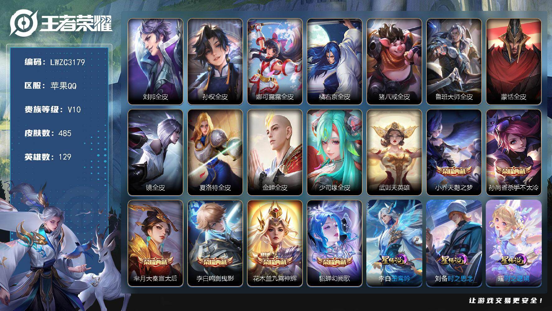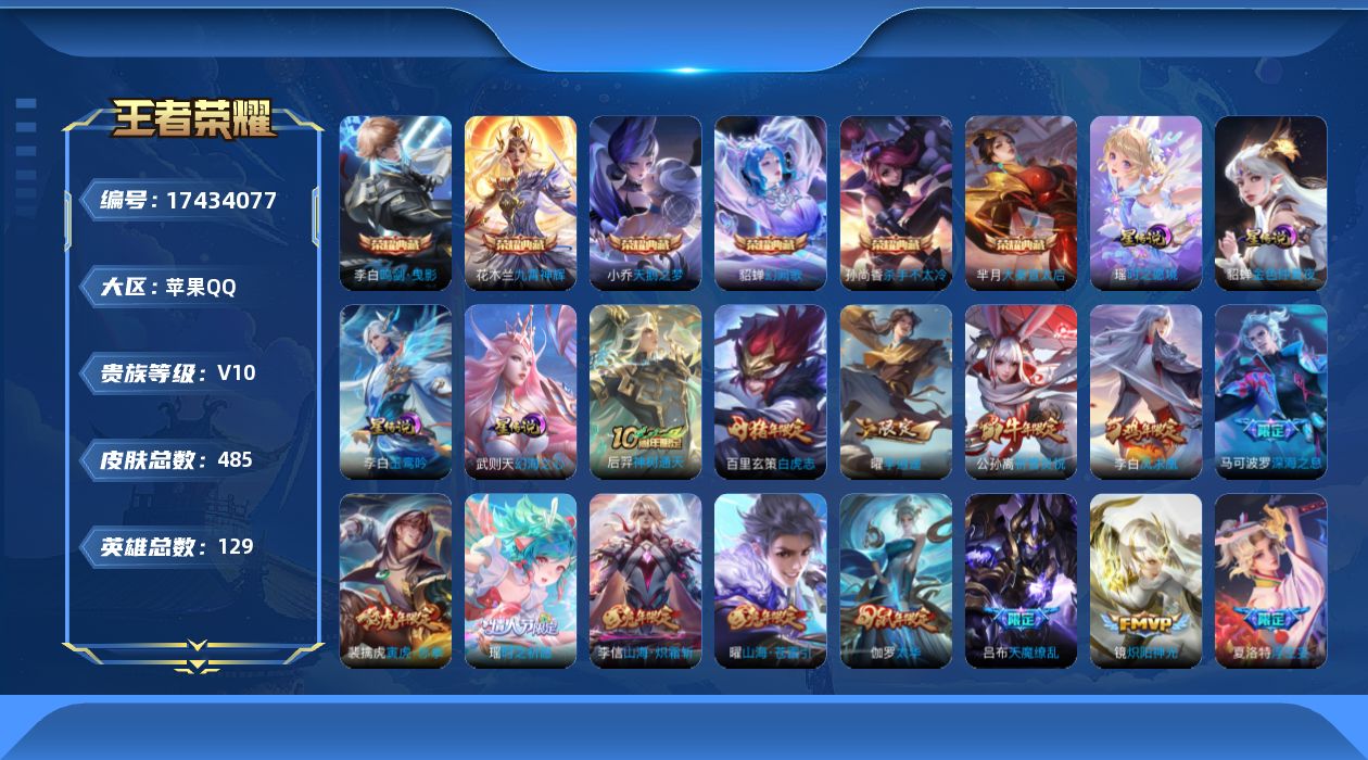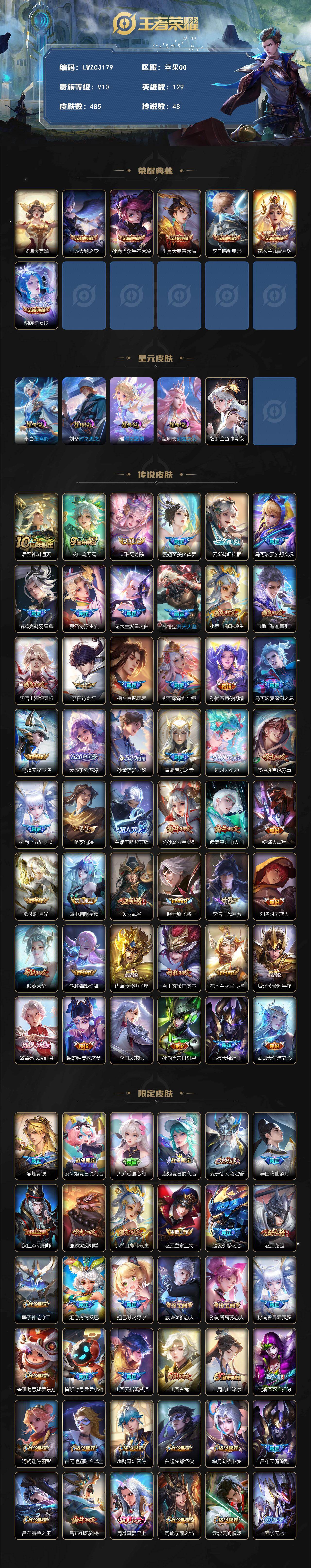 [17434077]可二次【特价出售/店主推荐/2省标/4市标/33段打野/紫瑶】:苹果Q-V10-至尊星耀IV段位-129英雄-485皮肤-6典藏皮肤-1典藏英雄-5星元-48传说-169史诗