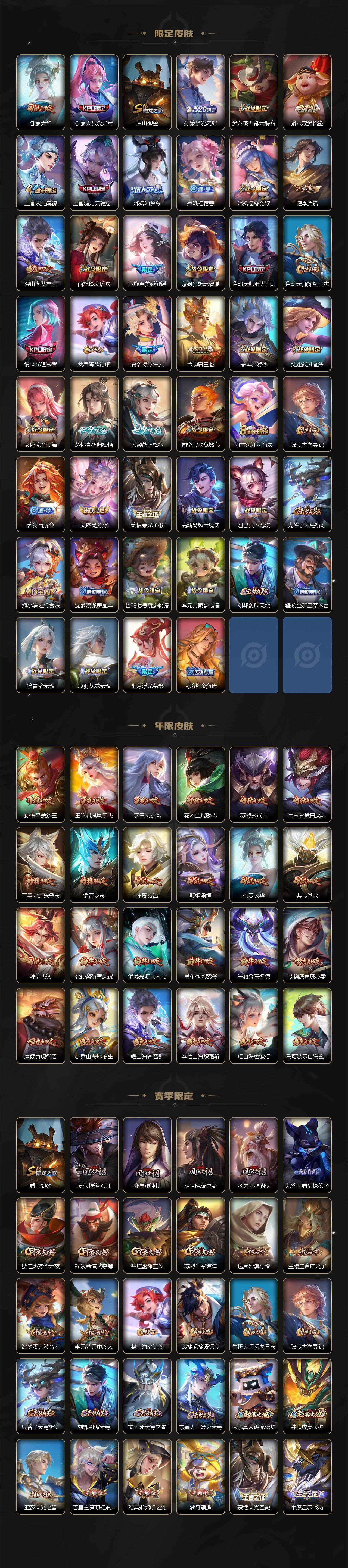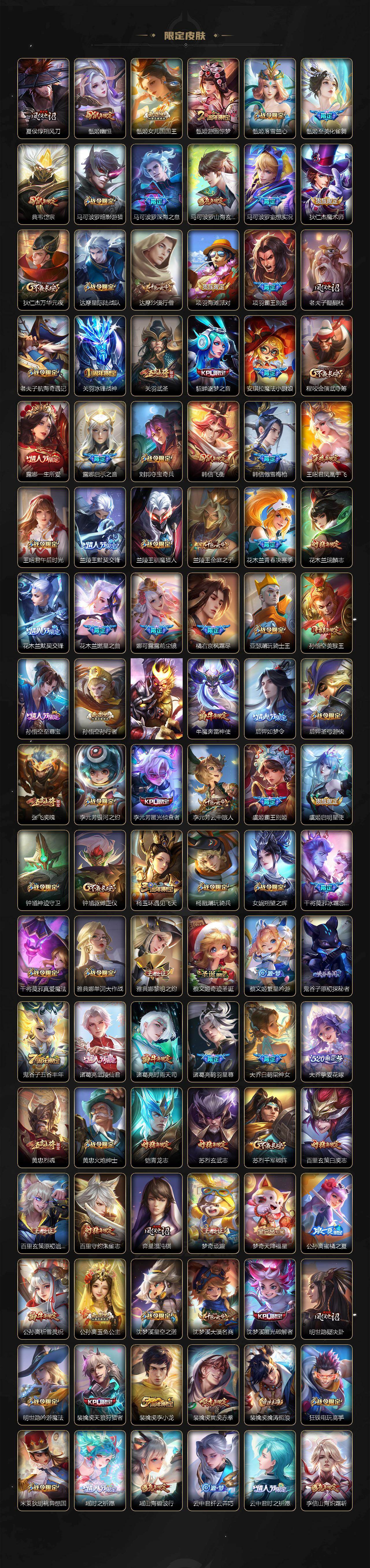 【限定皮肤】:暃埋骨钱,蔡文姬夏日便利店,大乔绒语心约,虞姬夏日便利店,姜子牙天穹之誓,李白谪仙醉月,狄仁杰阴阳师,廉颇寅虎御盾,小乔山海琳琅生,赵云皇家上将,赵云引擎之心,赵云龙胆,墨子神迹守卫,妲己热情桑巴,妲己时之奇旅,嬴政优雅恋人,孙尚香蔷薇恋人,孙尚香异界灵契,鲁班七号狮舞东方,鲁班七号乒乒小将,庄周云端筑梦师,庄周玄嵩,庄周高山流水,高渐离死亡摇滚,阿轲迷踪丽影,钟无艳超时空战士,扁鹊奇幻香踪,白起夜都怪侠,芈月幻夜卜梦,吕布天魔缭乱,吕布猎兽之王,吕布御风骁将,周瑜真爱至上,周瑜赤莲之焰,元歌云间偶戏,元歌无心,夏侯惇朔风刀,甄姬幽恒,甄姬女儿国国王,甄姬游园惊梦,甄姬落雪兰心,甄姬至美化雀舞,典韦岱宗,马可波罗暗影游猎,马可波罗深海之息,马可波罗山海玄木吟,马可波罗妄想实况,狄仁杰魔术师,狄仁杰万华元夜,达摩星际陆战队,达摩沙漠行僧,项羽海滩派对,项羽霸王别姬,老夫子醍醐杖,老夫子航海奇遇记,关羽冰锋战神,关羽武圣,貂蝉逐梦之音,