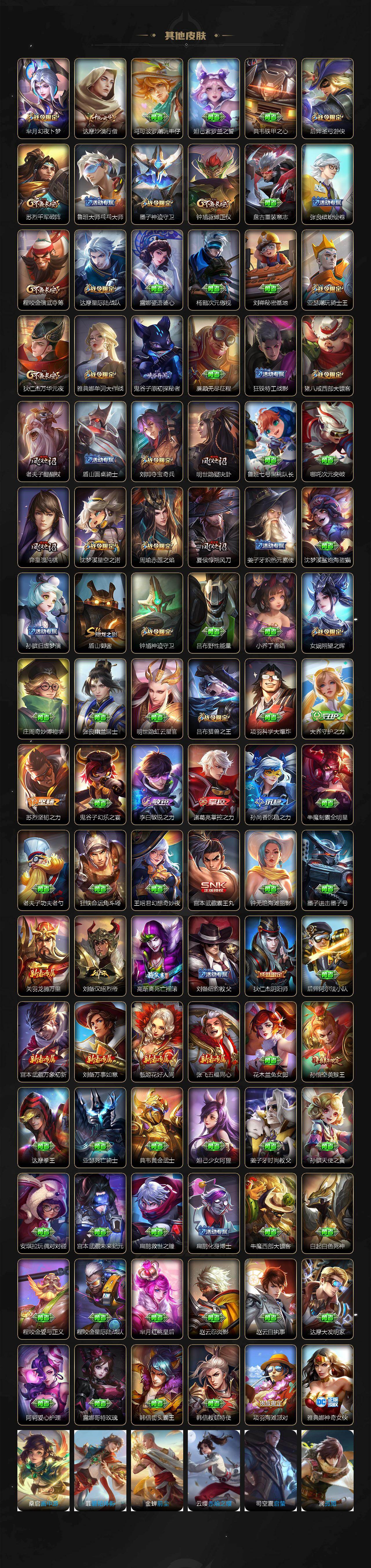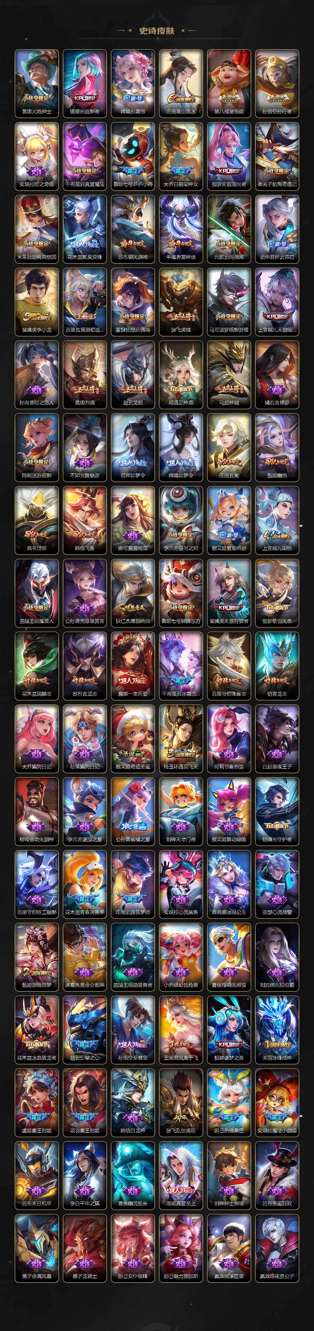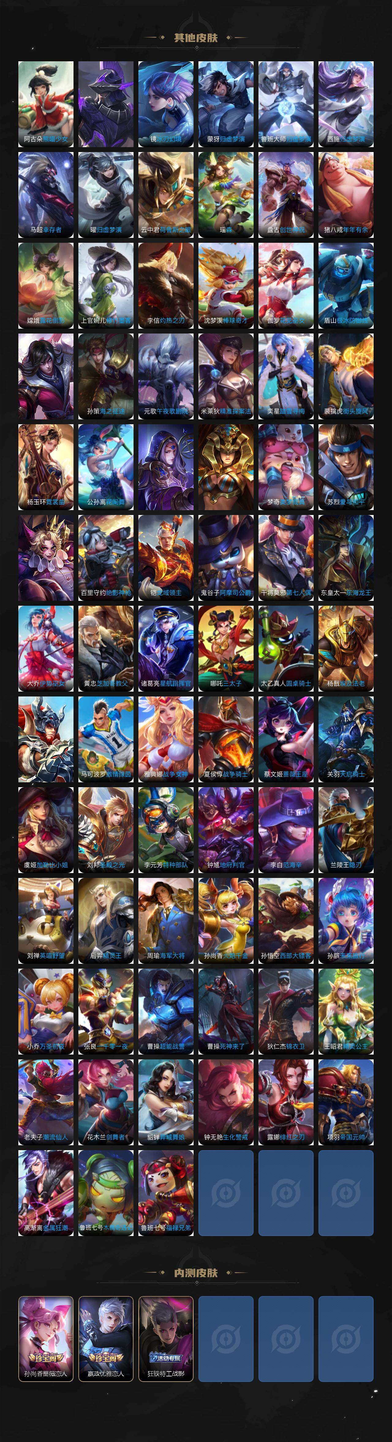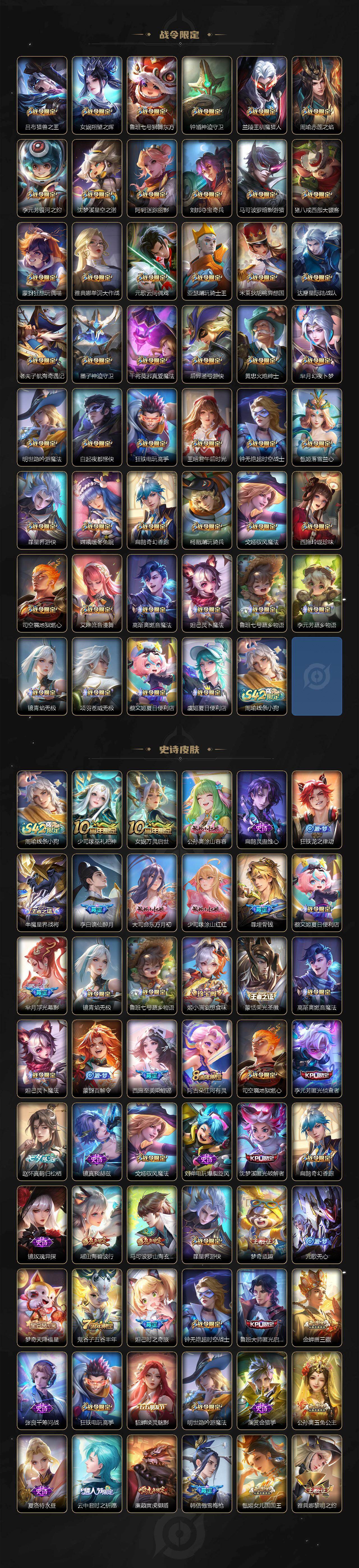 关羽冰锋战神,裴擒虎李小龙,上官婉儿梁祝,牛魔奔雷神使,貂蝉逐梦之音,公孙离祈雪灵祝,吕布御风骁将,诸葛亮时雨天司,赵云龙胆,关羽武圣,黄忠烈魂,张飞虎魄,马超神威,庄周玄嵩,典韦岱宗,甄姬幽恒,韩信飞衡,伽罗太华,裴擒虎天狼狩猎者,上官婉儿天狼绘梦者,伽罗天狼溯光者,铠青龙志,百里玄策白虎志,花木兰瑞麟志,苏烈玄武志,百里守约朱雀志,王昭君凤凰于飞,项羽霸王别姬,虞姬霸王别姬,周瑜真爱至上,露娜一生所爱,花木兰默契交锋,兰陵王默契交锋,后羿如梦令,嫦娥如梦令,孙悟空至尊宝,雅典娜神奇女侠,妲己热情桑巴,干将莫邪冰霜恋舞曲,花木兰青春决赛季,蔡文姬奇迹圣诞,公孙离蜜橘之夏,安琪拉魔法小厨娘,赵云引擎之心,孙悟空美猴王,庄周云端筑梦师,鲁班七号乒乒小将,大乔白鹤梁神女,猪八戒猪悟能,廉颇寅虎·御盾,孙尚香异界灵契,孙悟空孙行者,甄姬女儿国国王,镜匿光追影者,韩信傲雪梅枪,裴擒虎寅虎·赤拳,云中君时之祈愿,瑶时之祈愿,公孙离玉兔公主,露娜启示之音,马可波罗深海之息,金蝉唐三藏,娜可露露前尘镜,橘右京枫霜尽,鲁班大师匿光启智者,妲己时之奇旅,李白诗剑行,马可波罗山海·玄木吟,瑶山海·碧波行,西施至美·乘鲤谣,甄姬至美·化雀舞,桑启鸣野蒿