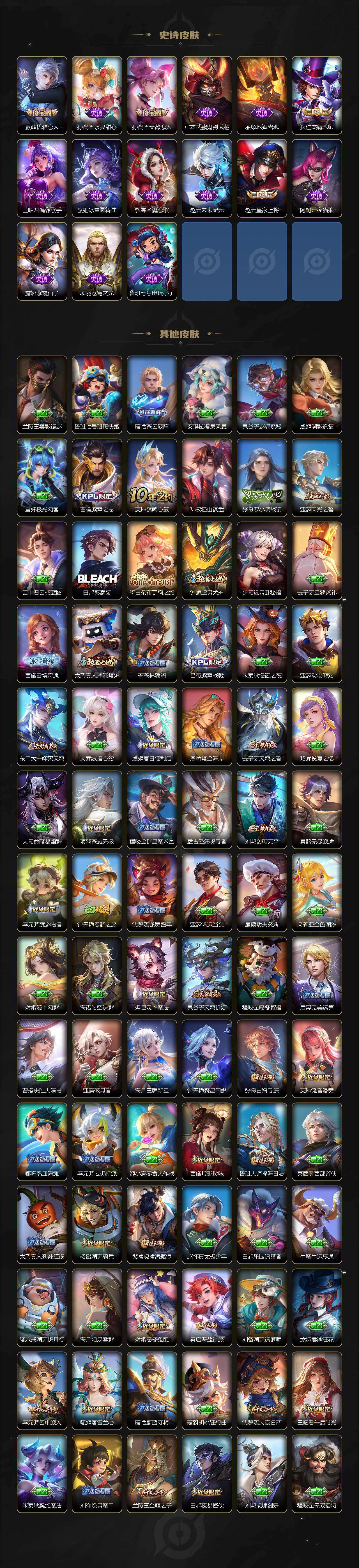 瑶遇见神鹿,娜可露露晚萤,伽罗箭羽风息,李元芳逐浪之夏,不知火舞魅语,公孙离无限星赏官,大乔猫狗日记,孙策猫狗日记,阿轲节奏热浪,露娜紫霞仙子,诸葛亮黄金分割率,王昭君偶像歌手,韩信白龙吟,项羽苍穹之光,孙尚香时之恋人,阿轲暗夜猫娘,雅典娜冰冠公主,吕布末日机甲,鲁班七号电玩小子,橘右京修罗,墨子龙骑士,嬴政摇滚巨星,刘禅绅士熊喵,刘禅天才门将,白起星夜王子,安琪拉心灵骇客,安琪拉时之奇旅,程咬金功夫厨神,刘邦德古拉伯爵,兰陵王暗隐猎兽者,曹操幽灵船长,宫本武藏鬼剑武藏,亚瑟心灵战警,蔡文姬舞动绿茵,廉颇地狱岩魂,小乔缤纷独角兽,夏侯惇乘风破浪,花木兰水晶猎龙者,铠曙光守护者,墨子金属风暴,百里玄策原初追逐者,吕布圣诞狂欢,貂蝉圣诞恋歌,百里守约特工魅影,嬴政暗夜贵公子,嫦娥拒霜思,雅典娜黎明之约,李白千年之狐,夏洛特永昼,澜赏金猎手,貂蝉唤灵魅影,张良千筹问战,镜玫瑰异探,沈梦溪匿光破解者,刘禅电玩·爆裂旋风,镜真我赫兹,赵怀真鹤归松栖,李元芳匿光侦查者,蒙犽百解令,高渐离燃音魔法,李白谪仙醉月