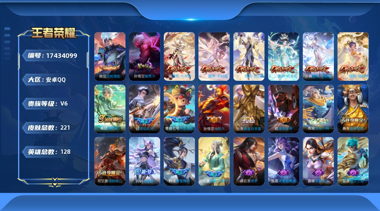 [17434099]可二次【特价出售/店主推荐】:安卓Q-V6-至尊星耀IV段位-128英雄-221皮肤-1典藏皮肤-12传说-1星传说-69史诗