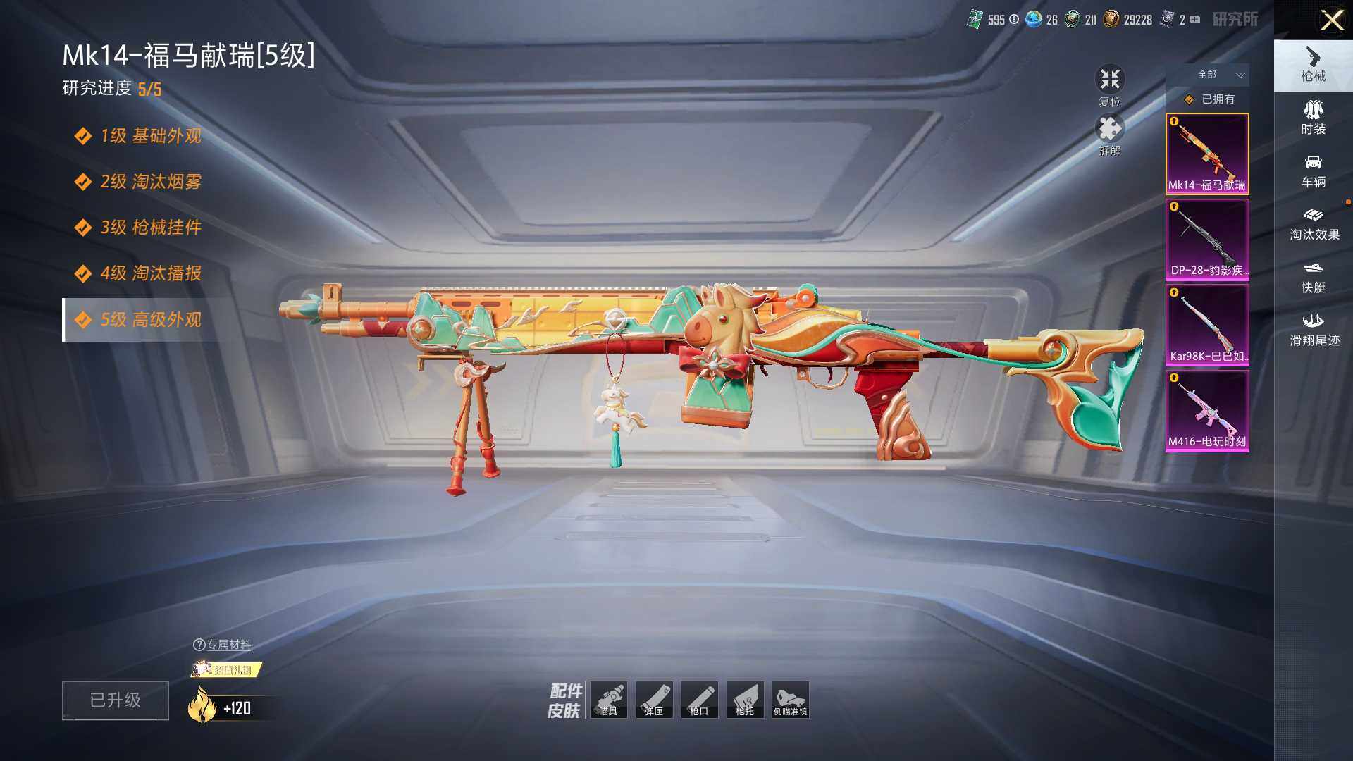 【粉色枪皮等级】:M416-电玩时刻(五级),Kar98K-巳巳如意(五级),Mk14-福马献瑞(五级),DP-28-豹影疾电(五级)