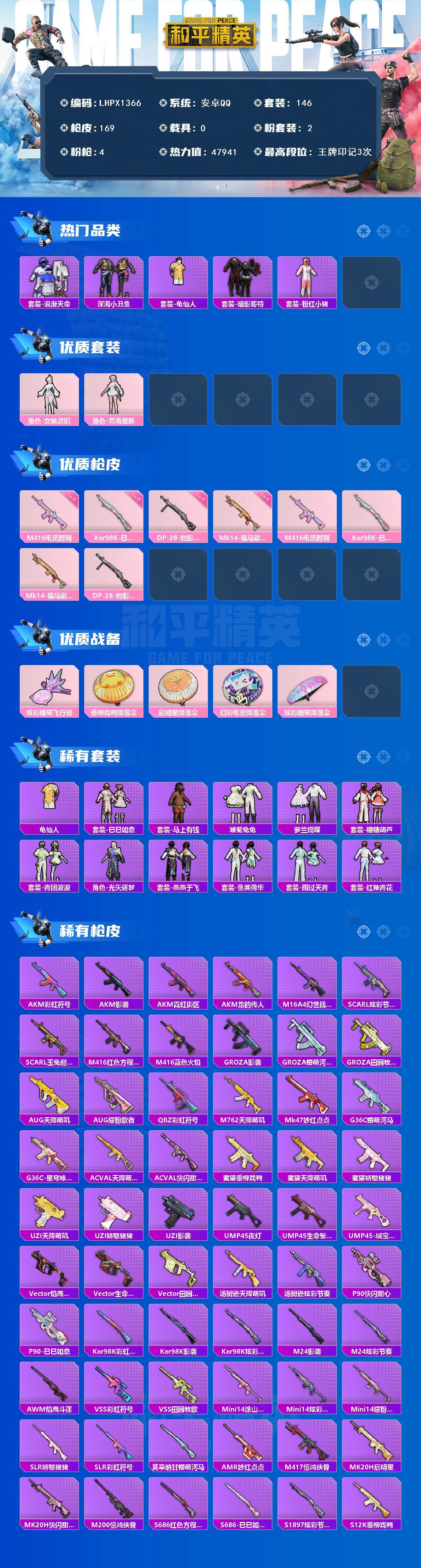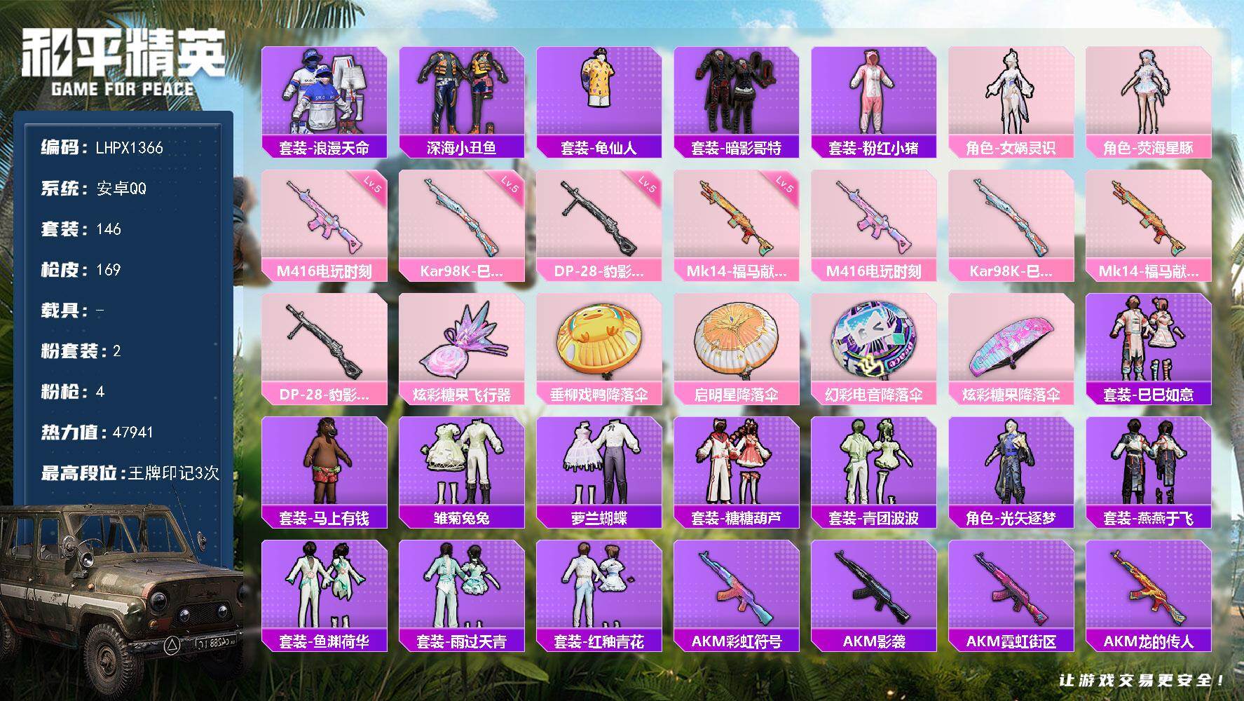 [17434186]可二次【特价出售/店主推荐】安卓 手Q-2粉装-4特效枪-0载具-1粉色飞行器-47941热力值-3王牌印记-146套装-169枪皮 【热门品类】:套装-浪漫天命,套装-深海小丑鱼,套装-龟仙人,套装-暗影哥特,套装-粉红小猪 【粉色套装】:角色-女娲灵识,角色-荧海星豚 【粉色枪皮等级】:M416-电玩时刻(五级),Kar98K-巳巳如意(五级),Mk14-福马献瑞(五级),DP-28-豹影疾电(五级) 【粉色枪皮】:M416-电玩时刻,Kar98K-巳巳如意,Mk14-福马献瑞,DP-28-豹影疾电 【粉色飞行器】:炫彩糖果飞行器 【粉色降落伞】:垂柳戏鸭降落伞,启明星降落伞,幻彩电音降落伞,炫彩糖果降落伞 【稀有套装】:套装-龟仙人,套装-巳巳如意,套装-炫彩糖果,套装-马上有钱,套装-雏菊兔兔,套装-萝兰蝴蝶,套装-糖糖葫芦,套装-青团波波,角色-光矢逐梦,套装-燕燕于飞,套装-鱼渊荷华,套装-雨过天青,套装-红釉青花 【稀有枪皮】:AKM-彩虹符号,AKM-影袭,AKM-霓虹街区,AKM-龙的传人,M16A4-幻世战舞者,SCAR-L-炫彩节奏,SCAR-L-玉兔迎春,M416-红色方程式,M416-蓝色火焰,GROZA-影袭,GROZA-懵萌河马,GROZA-田园牧歌,AUG-天降萌叽,AUG-耀粉歌者,QBZ-彩虹符号,M762-天降萌叽,Mk47-妙红点点,G36C-懵萌河马,G36C-星穹咏叹调,AC-VAL-天降萌叽,AC-VAL-快闪甜心,蜜獾-垂柳戏鸭,蜜獾-天降萌叽,蜜獾-娇憨猪猪,UZI-天降萌叽,UZI-娇憨猪猪,UZI-影袭,UMP45-夜灯,UMP45-生命誓言,UMP45-绒宝小鹅,Vector-焰鹰斗篷,Vector-生命誓言,Vector-田园牧歌,汤姆逊-天降萌叽,汤姆逊-炫彩节奏,P90-快闪甜心,P90-巳巳如意,Kar98K-彩虹符号,Kar98K-影袭,Kar98K-炫彩节奏,M24-影袭,M24-炫彩节奏,AWM-焰鹰斗篷,VSS-彩虹符号,VSS-田园牧歌,Mini14-涂山之恋,Mini14-炫彩节奏,Mini14-耀粉歌者,SLR-娇憨猪猪,SLR-彩虹符号,莫辛纳甘-懵萌河马,AMR-妙红点点,M417-惊鸿侠骨,MK20-H-启明星,MK20-H-快闪甜心,M200-惊鸿侠骨,S686-红色方程式,S6