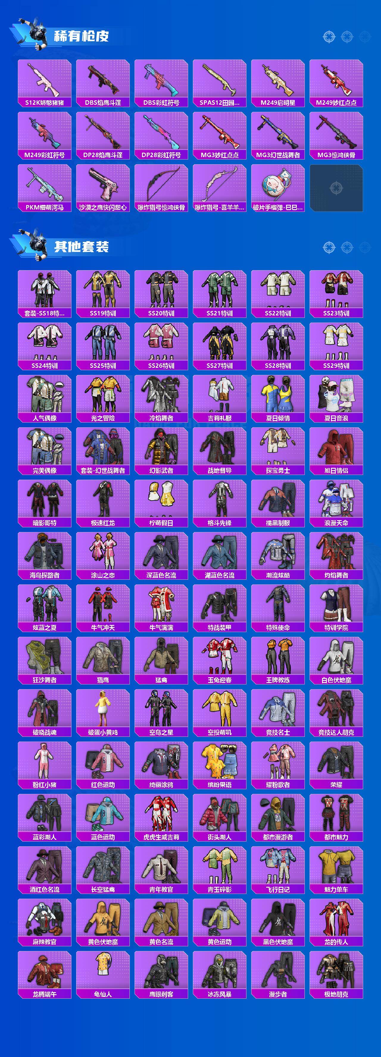 【稀有枪皮】:AKM-彩虹符号,AKM-影袭,AKM-霓虹街区,AKM-龙的传人,M16A4-幻世战舞者,SCAR-L-炫彩节奏,SCAR-L-玉兔迎春,M416-红色方程式,M416-蓝色火焰,GROZA-影袭,GROZA-懵萌河马,GROZA-田园牧歌,AUG-天降萌叽,AUG-耀粉歌者,QBZ-彩虹符号,M762-天降萌叽,Mk47-妙红点点,G36C-懵萌河马,G36C-星穹咏叹调,AC-VAL-天降萌叽,AC-VAL-快闪甜心,蜜獾-垂柳戏鸭,蜜獾-天降萌叽,蜜獾-娇憨猪猪,UZI-天降萌叽,UZI-娇憨猪猪,UZI-影袭,UMP45-夜灯,UMP45-生命誓言,UMP45-绒宝小鹅,Vector-焰鹰斗篷,Vector-生命誓言,Vector-田园牧歌,汤姆逊-天降萌叽,汤姆逊-炫彩节奏,P90-快闪甜心,P90-巳巳如意,Kar98K-彩虹符号,Kar98K-影袭,Kar98K-炫彩节奏,M24-影袭,M24-炫彩节奏,AWM-焰鹰斗篷,VSS-彩虹符号,VSS-田园牧歌,Mini14-涂山之恋,Mini14-炫彩节奏,Mini14-耀粉歌者,SLR-娇憨猪猪,SLR-彩虹符号,莫辛纳甘-懵萌河马,AMR-妙红点点,M417-惊鸿侠骨,MK20-H-启明星,MK20-H-快闪甜心,M200-惊鸿侠骨,S686-红色方程式,S6