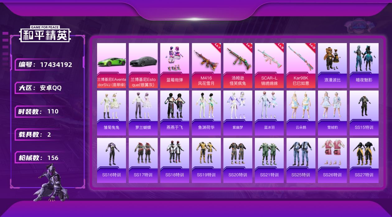 [17434192]安卓 手Q-2粉装-7特效枪-2载具-1粉色飞行器-53976热力值-11王牌印记-110套装-156枪皮