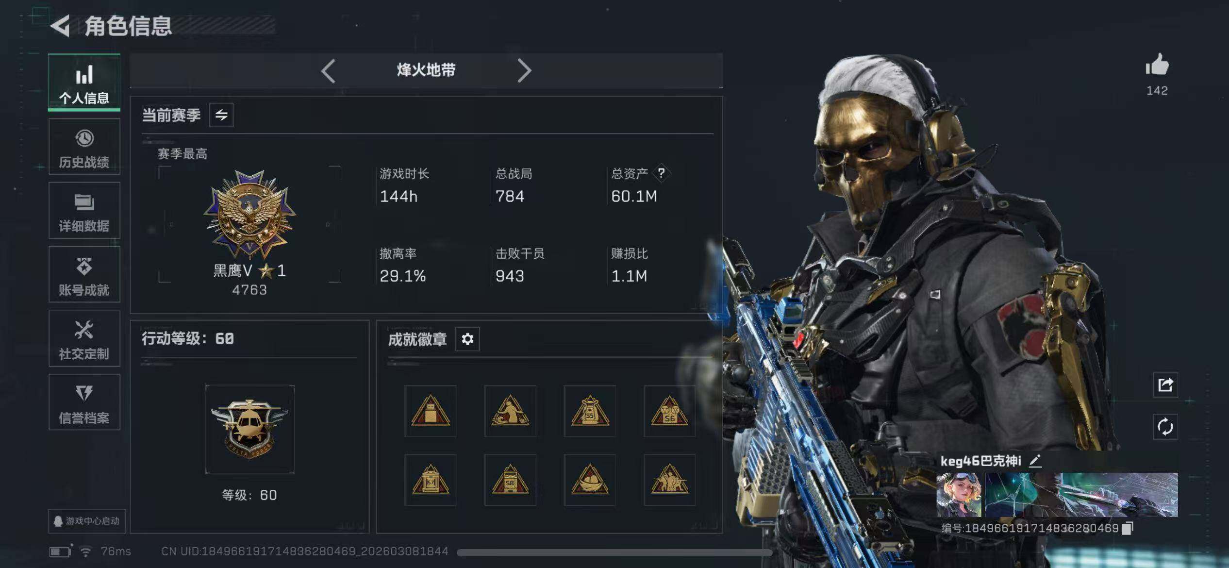 [17434386]【特价出售/店主推荐】60m总资产-1137k哈伏币-60烽火等级-黑鹰-41战场等级-上等兵
