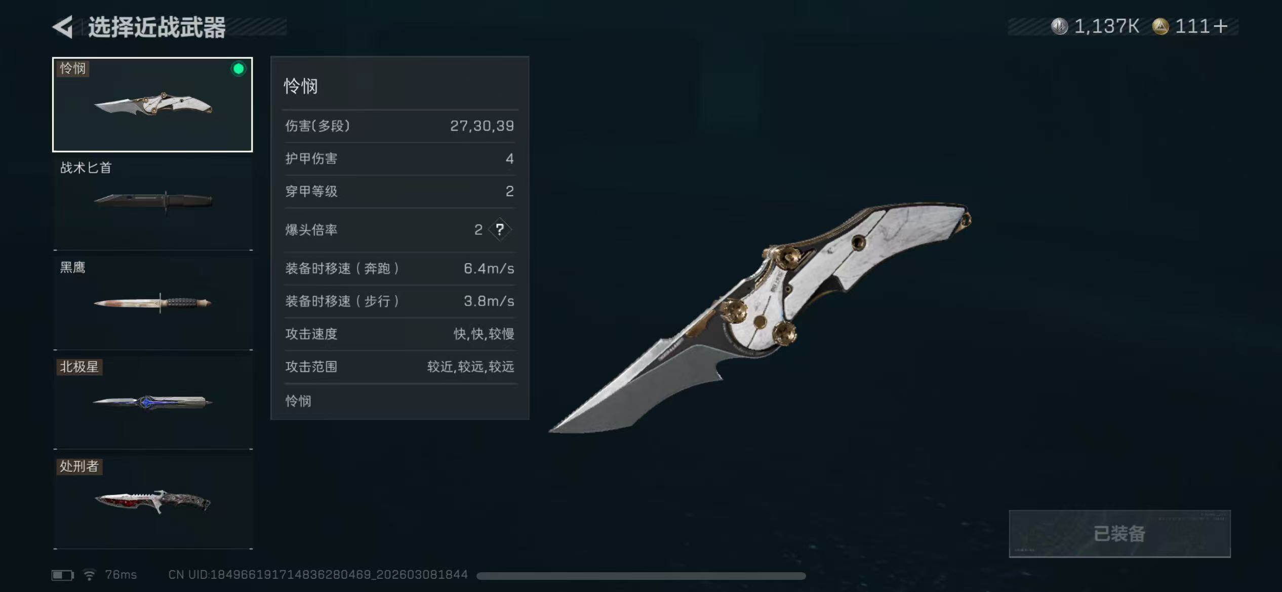 【近战皮肤】:近战-北极星,近战-怜悯,近战-处刑者4级,近战-黑鹰