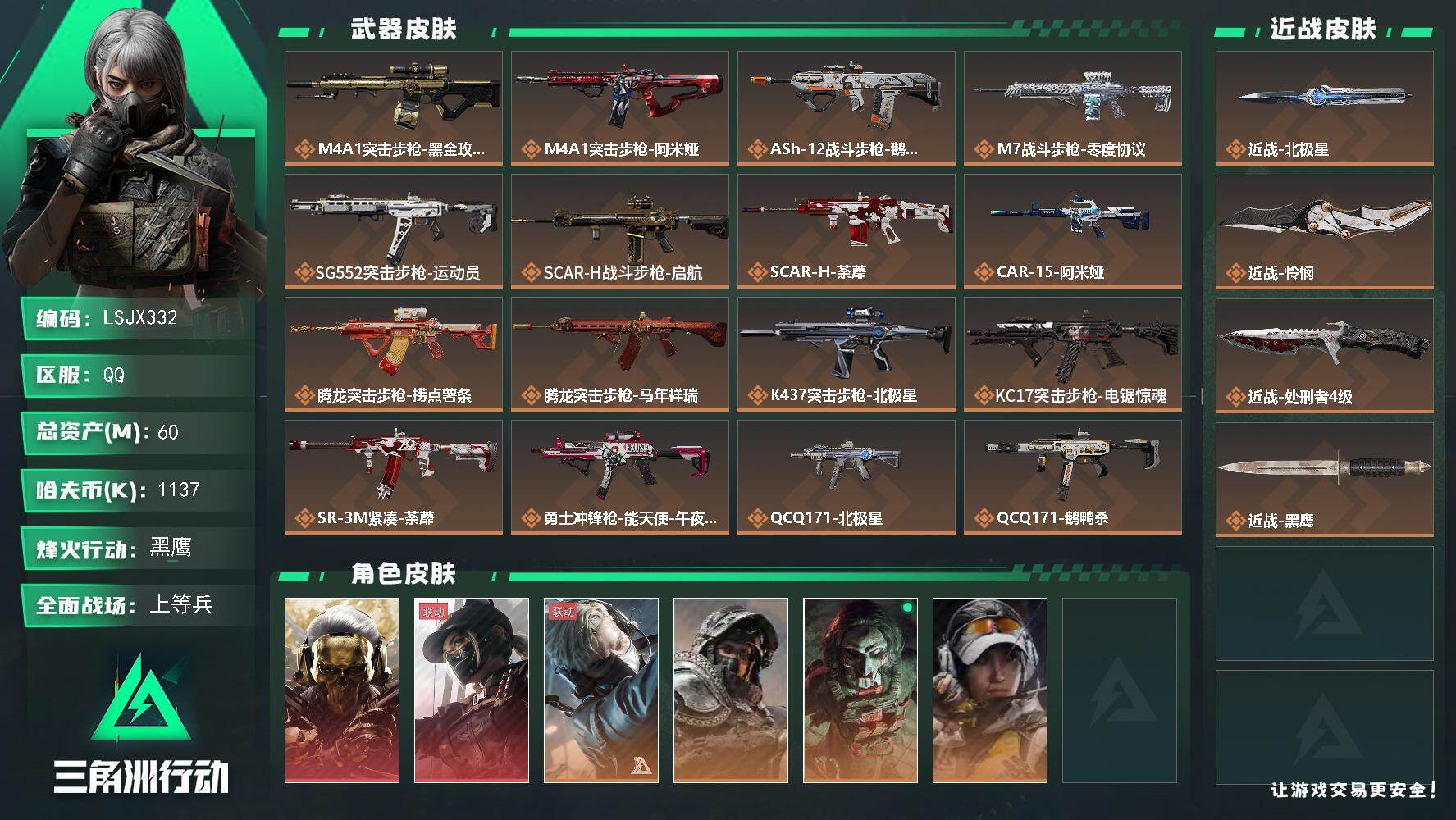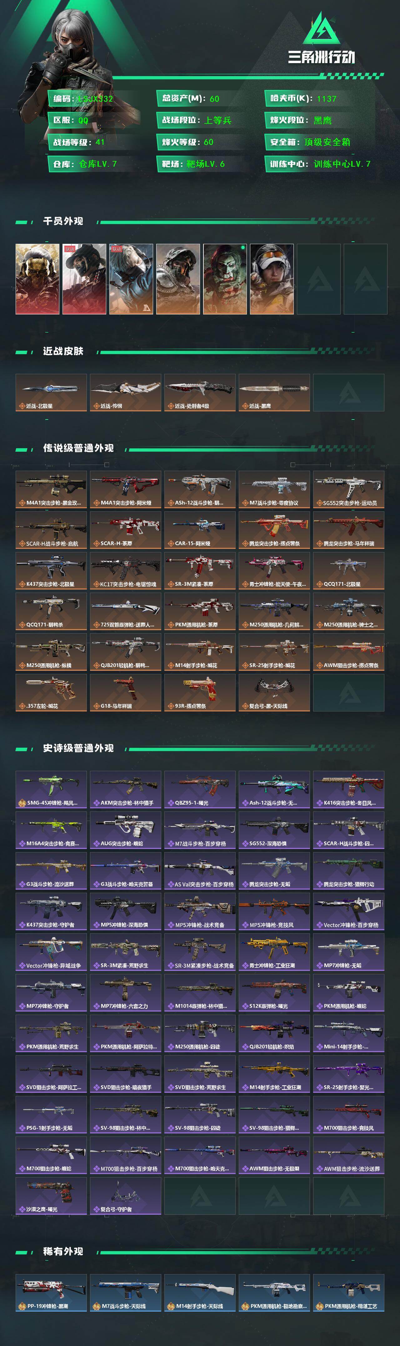 [17434386]【特价出售/店主推荐】60m总资产-1137k哈伏币-60烽火等级-黑鹰-41战场等级-上等兵 【干员外观】:红狼-蚀金玫瑰,露娜-黑·天际线,蜂医-送葬人·无题密令,深蓝-不破誓约,红狼-电锯惊魂,露娜-金牌射手 【近战皮肤】:近战-北极星,近战-怜悯,近战-处刑者4级,近战-黑鹰 【传说外观】:M4A1突击步枪-蚀金玫瑰,M4A1突击步枪-阿米娅,ASh-12战斗步枪-鹅鸭杀,M7战斗步枪-零度协议,SG552突击步枪-运动员,SCAR-H战斗步枪-启航,SCAR-H战斗步枪-荼蘼,CAR-15突击步枪-阿米娅,腾龙突击步枪-捞点薯条,腾龙突击步枪-马年祥瑞,K437突击步枪-北极星,KC17突击步枪-电锯惊魂,SR-3M紧凑突击步枪-荼蘼,勇士冲锋枪-能天使-午夜邮差,QCQ171冲锋枪-北极星,QCQ171冲锋枪-鹅鸭杀,725双管霰弹枪-送葬人-无题密令,PKM通用机枪-荼蘼,M250通用机枪-几何解构,M250通用机枪-骑士之心,M250通用机枪-纵横,QJB201轻机枪-鹅鸭杀,M14射手步枪-缄花,SR-25射手步枪-缄花,AWM狙击步枪-捞点薯条,.357左轮-缄花,G18-马年祥瑞,93R-捞点薯条,复合弓-黑·天际线 【史诗外观】:SMG-45冲锋枪-飓风行动,AKM突击步枪-林中猎手,QBZ95-1突击步枪-曙光,ASh-12战斗步枪-无极限,K416突击步枪-冬日风情,M16A4突击步枪-竞赛选手,AUG突击步枪-蝮蛇,M7战斗步枪-百步穿杨,SG552突击步枪-深海恐惧,SCAR-H战斗步枪-囚徒,G3战斗步枪-流沙送葬,G3战斗步枪-哈夫克警备,AS Val突击步枪-百步穿杨,腾龙突击步枪-无垢,腾龙突击步枪-猎鳄行动,K437突击步枪-守护者,MP5冲锋枪-深海恐惧,MP5冲锋枪-战术竞备,MP5冲锋枪-竞技风,P90冲锋枪-紧急戒备,Vector冲锋枪-百步穿杨,Vector冲锋枪-异域战争,SR-3M紧凑突击步枪-荒野求生,SR-3M紧凑突击步枪-战术竞备,勇士冲锋枪-工业狂潮,MP7冲锋枪-无垢,MP7冲锋枪-守护者,MP7冲锋枪-六套之力,M1014霰弹枪-林中猎手,S12K霰弹枪-曙光,PKM通用机枪-蝮蛇,PKM通用机枪-荒野求生,PKM通用机枪-阿萨拉特攻,M250通用机枪-囚徒,QJB201轻机枪-炽焰,QJB201
