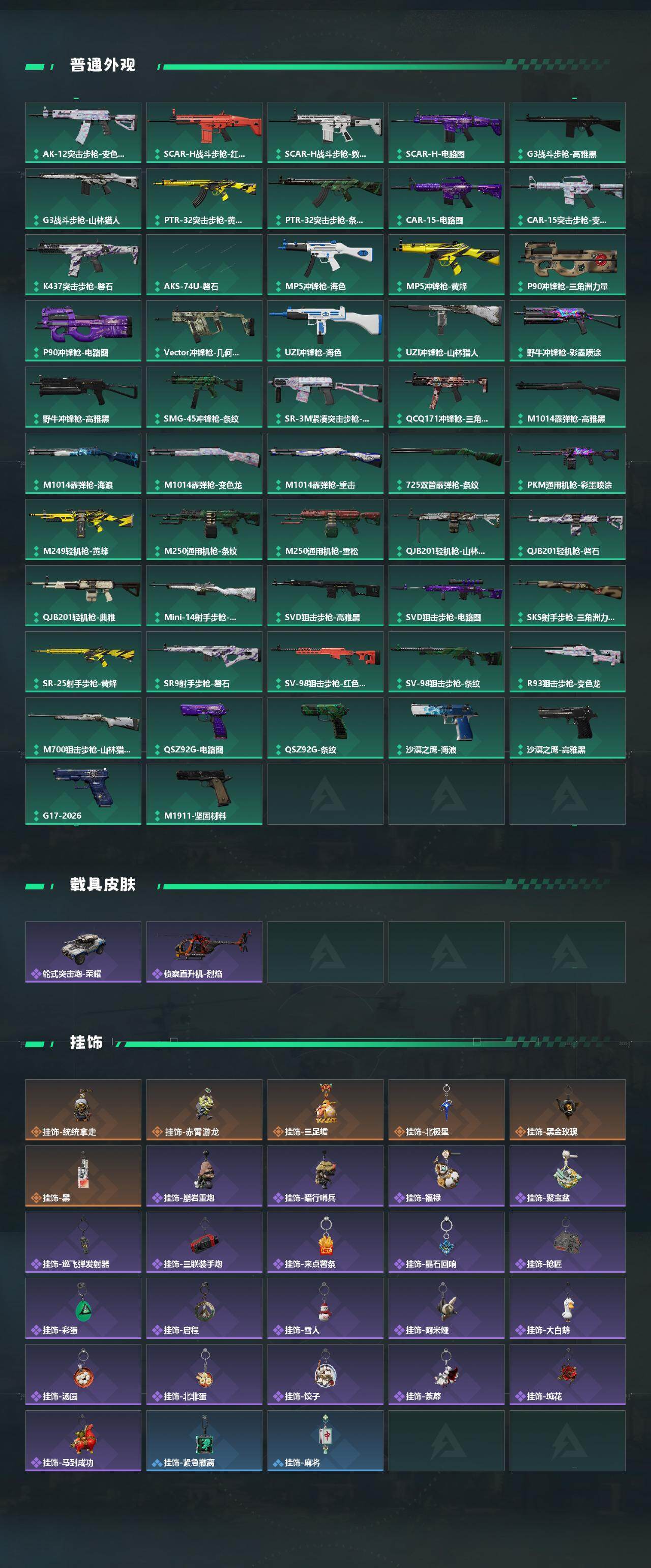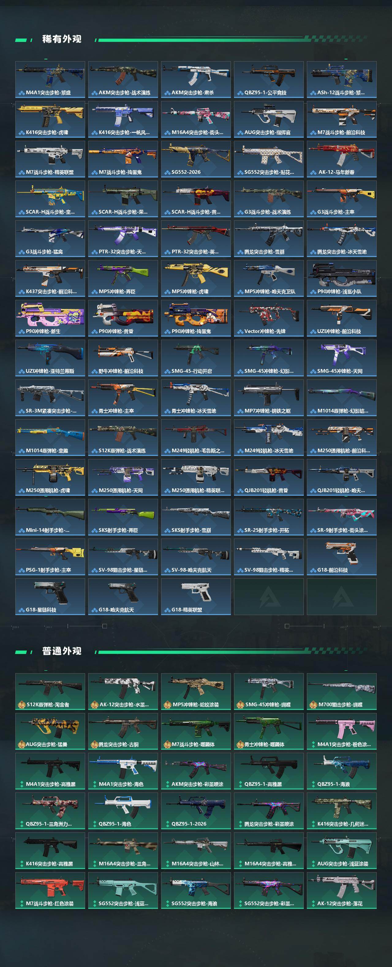 【史诗外观】:SMG-45冲锋枪-飓风行动,AKM突击步枪-林中猎手,QBZ95-1突击步枪-曙光,ASh-12战斗步枪-无极限,K416突击步枪-冬日风情,M16A4突击步枪-竞赛选手,AUG突击步枪-蝮蛇,M7战斗步枪-百步穿杨,SG552突击步枪-深海恐惧,SCAR-H战斗步枪-囚徒,G3战斗步枪-流沙送葬,G3战斗步枪-哈夫克警备,AS Val突击步枪-百步穿杨,腾龙突击步枪-无垢,腾龙突击步枪-猎鳄行动,K437突击步枪-守护者,MP5冲锋枪-深海恐惧,MP5冲锋枪-战术竞备,MP5冲锋枪-竞技风,P90冲锋枪-紧急戒备,Vector冲锋枪-百步穿杨,Vector冲锋枪-异域战争,SR-3M紧凑突击步枪-荒野求生,SR-3M紧凑突击步枪-战术竞备,勇士冲锋枪-工业狂潮,MP7冲锋枪-无垢,MP7冲锋枪-守护者,MP7冲锋枪-六套之力,M1014霰弹枪-林中猎手,S12K霰弹枪-曙光,PKM通用机枪-蝮蛇,PKM通用机枪-荒野求生,PKM通用机枪-阿萨拉特攻,M250通用机枪-囚徒,QJB201轻机枪-炽焰,QJB201