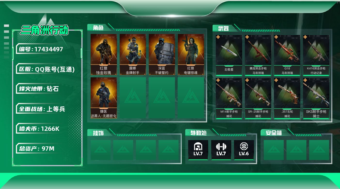 [17434497]可二次【特价出售/店主推荐】97m总资产-1266k哈伏币-60烽火等级-钻石-49战场等级-上等兵 【干员外观】:红狼-蚀金玫瑰,蜂医-送葬人·无题密令,深蓝-不破誓约,红狼-电锯惊魂,露娜-金牌射手 【近战皮肤】:近战-北极星,近战-黑鹰 【传说外观】:M4A1突击步枪-蚀金玫瑰,M4A1突击步枪-阿米娅,ASh-12战斗步枪-鹅鸭杀,K416突击步枪-行动记录,M16A4突击步枪-狩猎时刻,AUG突击步枪-悠然茶歇,SG552突击步枪-运动员,SCAR-H战斗步枪-启航,G3战斗步枪-狩猎时刻,G3战斗步枪-骑士,CAR-15突击步枪-阿米娅,AS Val突击步枪-蛇年祥瑞,腾龙突击步枪-捞点薯条,腾龙突击步枪-马年祥瑞,KC17突击步枪-电锯惊魂,MK47突击步枪-悠然茶歇,Vector冲锋枪-狩猎时刻,UZI冲锋枪-悠然茶歇,勇士冲锋枪-能天使-午夜邮差,QCQ171冲锋枪-鹅鸭杀,725双管霰弹枪-送葬人-无题密令,M250通用机枪-骑士之心,QJB201轻机枪-鹅鸭杀,M14射手步枪-缄花,SKS射手步枪-骑士,SR-25射手步枪-缄花,AWM狙击步枪-捞点薯条,.357左轮-缄花,G18-马年祥瑞,93R-捞点薯条,复合弓-黑·天际线 【史诗外观】:MP7冲锋枪-原型机,AKM突击步枪-林中猎手,QBZ95-1突击步枪-曙光,ASh-12战斗步枪-无极限,K416突击步枪-冬日风情,K416突击步枪-阿萨拉特攻,M16A4突击步枪-竞赛选手,AUG突击步枪-蝮蛇,M7战斗步枪-百步穿杨,SG552突击步枪-深海恐惧,SG552突击步枪-哈夫克警备,SCAR-H战斗步枪-囚徒,G3战斗步枪-流沙送葬,G3战斗步枪-哈夫克警备,AS Val突击步枪-典狱官,AS Val突击步枪-百步穿杨,腾龙突击步枪-无垢,腾龙突击步枪-猎鳄行动,K437突击步枪-守护者,MP5冲锋枪-深海恐惧,MP5冲锋枪-战术竞备,MP5冲锋枪-竞技风,P90冲锋枪-暗影猎手,P90冲锋枪-紧急戒备,Vector冲锋枪-猎鳄行动,Vector冲锋枪-百步穿杨,Vector冲锋枪-异域战争,SMG-45冲锋枪-阿萨拉特攻,SR-3M紧凑突击步枪-荒野求生,SR-3M紧凑突击步枪-战术竞备,勇士冲锋枪-深海恐惧,勇士冲锋枪-工业狂潮,MP7冲锋枪-无垢,MP7冲锋枪-守护者,MP7冲