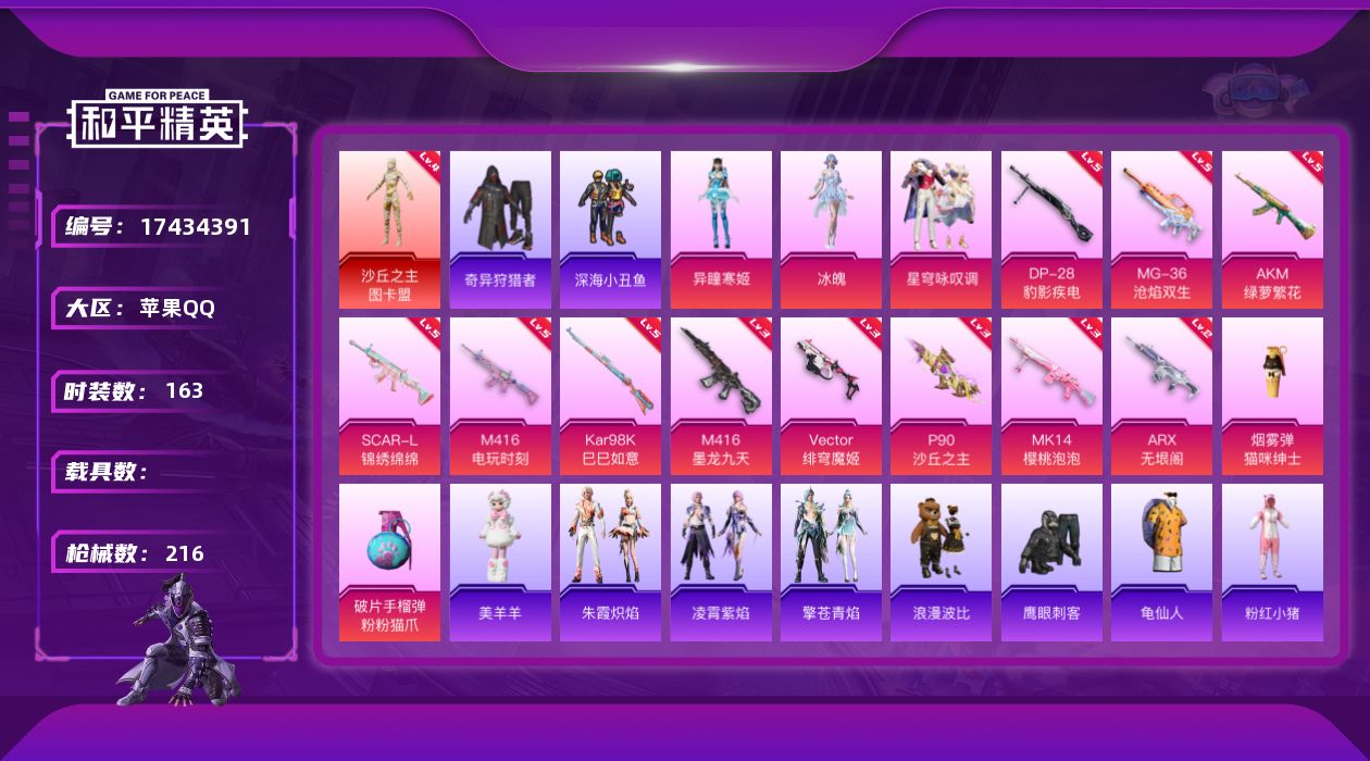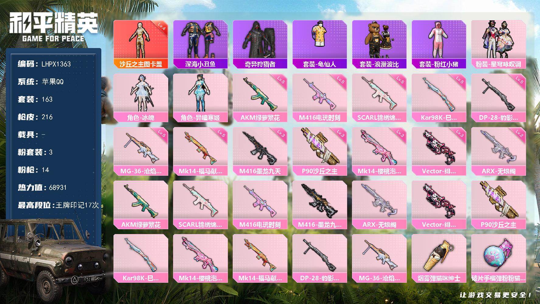 [17434391]苹果 手Q-1神装-3粉装-14特效枪-0载具-6粉色飞行器-68931热力值-17王牌印记-163套装-216枪皮