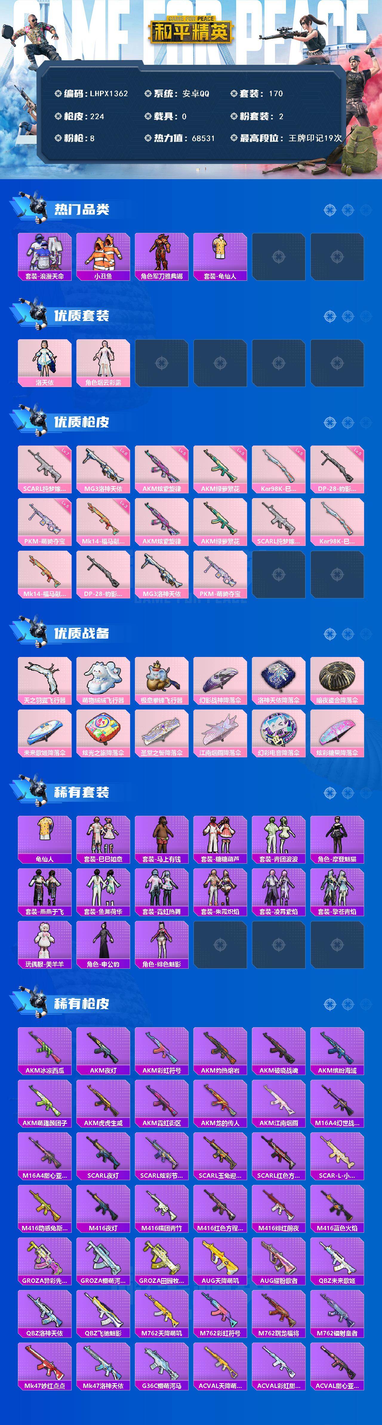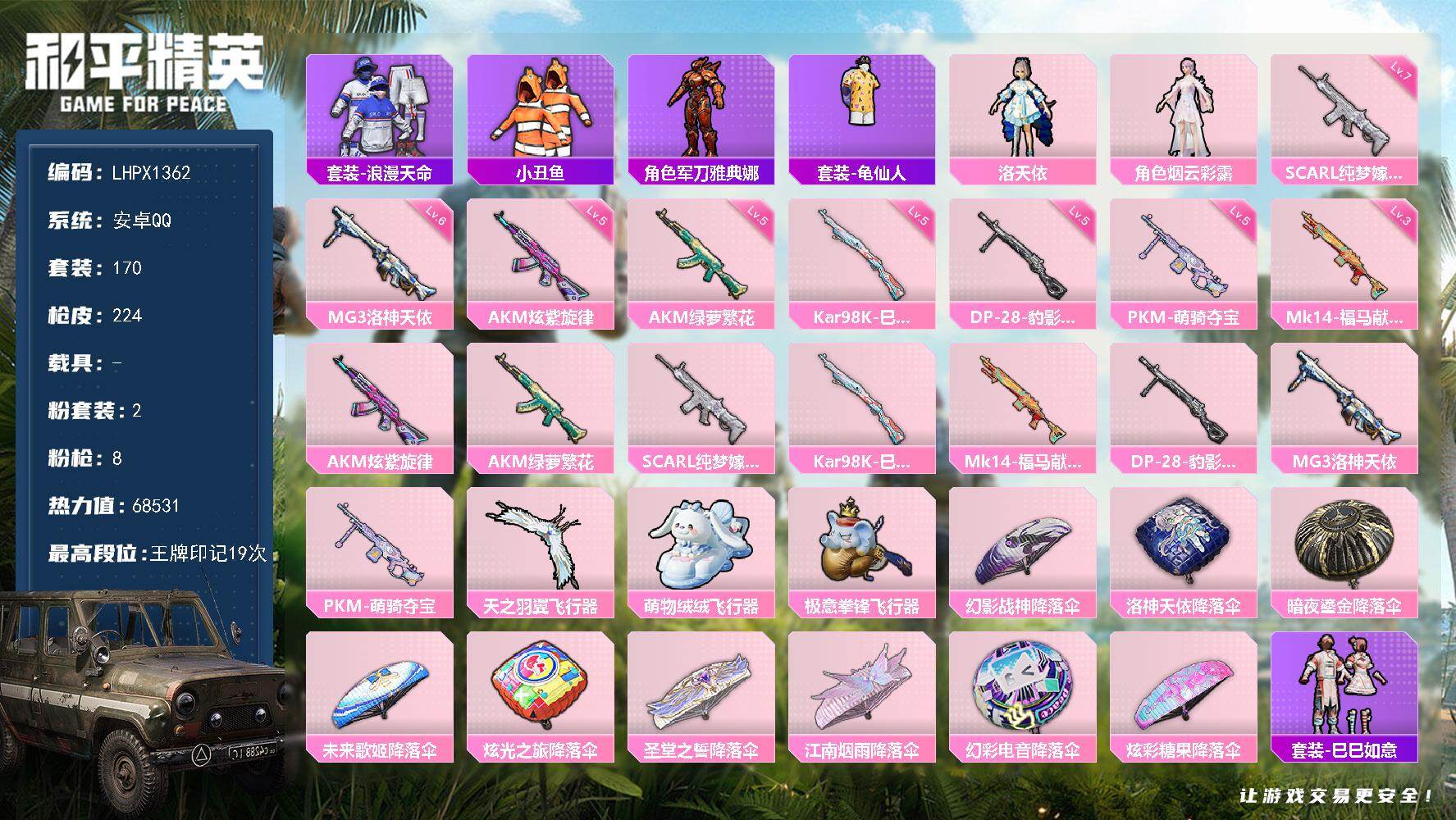 [17434395]安卓 手Q-2粉装-8特效枪-0载具-3粉色飞行器-68531热力值-19王牌印记-170套装-224枪皮 【热门品类】:套装-浪漫天命,套装-小丑鱼,角色-军刀雅典娜,套装-龟仙人 【粉色套装】:角色-洛天依,角色-烟云彩露 【粉色枪皮等级】:AKM-炫紫旋律(五级),AKM-绿萝繁花(五级),SCAR-L-纯梦嫁纱(七级),Kar98K-巳巳如意(五级),Mk14-福马献瑞(三级),DP-28-豹影疾电(五级),MG3-洛神天依(六级),PKM-萌骑夺宝(五级) 【粉色枪皮】:AKM-炫紫旋律,AKM-绿萝繁花,SCAR-L-纯梦嫁纱,Kar98K-巳巳如意,Mk14-福马献瑞,DP-28-豹影疾电,MG3-洛神天依,PKM-萌骑夺宝 【粉色飞行器】:天之羽翼飞行器,萌物绒绒飞行器,极意拳锋飞行器 【粉色降落伞】:幻影战神降落伞,洛神天依降落伞,暗夜鎏金降落伞,未来歌姬降落伞,炫光之旅降落伞,圣堂之誓降落伞,江南烟雨降落伞,幻彩电音降落伞,炫彩糖果降落伞 【稀有套装】:套装-龟仙人,套装-巳巳如意,套装-马上有钱,套装-糖糖葫芦,套装-青团波波,角色-摩登魅猫,套装-燕燕于飞,套装-鱼渊荷华,套装-霓虹热舞,套装-朱霞炽焰,套装-凌霄紫焰,套装-擎苍青焰,玩偶服-美羊羊,角色-申公豹,角色-绯色魅影 【稀有枪皮】:AKM-冰凉西瓜,AKM-夜灯,AKM-彩虹符号,AKM-江南烟雨,AKM-灼热熔岩,AKM-破晓战魂,AKM-缤纷海域,AKM-萌趣颜团子,AKM-虎虎生威,AKM-霓虹街区,AKM-龙的传人,M16A4-幻世战舞者,M16A4-甜心亚梦,SCAR-L-夜灯,SCAR-L-炫彩节奏,SCAR-L-玉兔迎春,SCAR-L-红色方程式,SCAR-L-小狗蛇点点,M416-动感兔斯基,M416-夜灯,M416-糯团青竹,M416-红色方程式,M416-绯红前夜,M416-蓝色火焰,GROZA-异彩先驱,GROZA-懵萌河马,GROZA-田园牧歌,AUG-天降萌叽,AUG-耀粉歌者,QBZ-未来歌姬,QBZ-洛神天依,QBZ-飞驰魅影,M762-天降萌叽,M762-彩虹符号,M762-瑞龙福将,M762-镭射皇者,Mk47-妙红点点,Mk47-洛神天依,G36C-懵萌河马,AC-VAL-天降萌叽,AC-VAL-彩虹甜喵,AC-VAL-甜心亚梦,蜜獾-垂柳戏