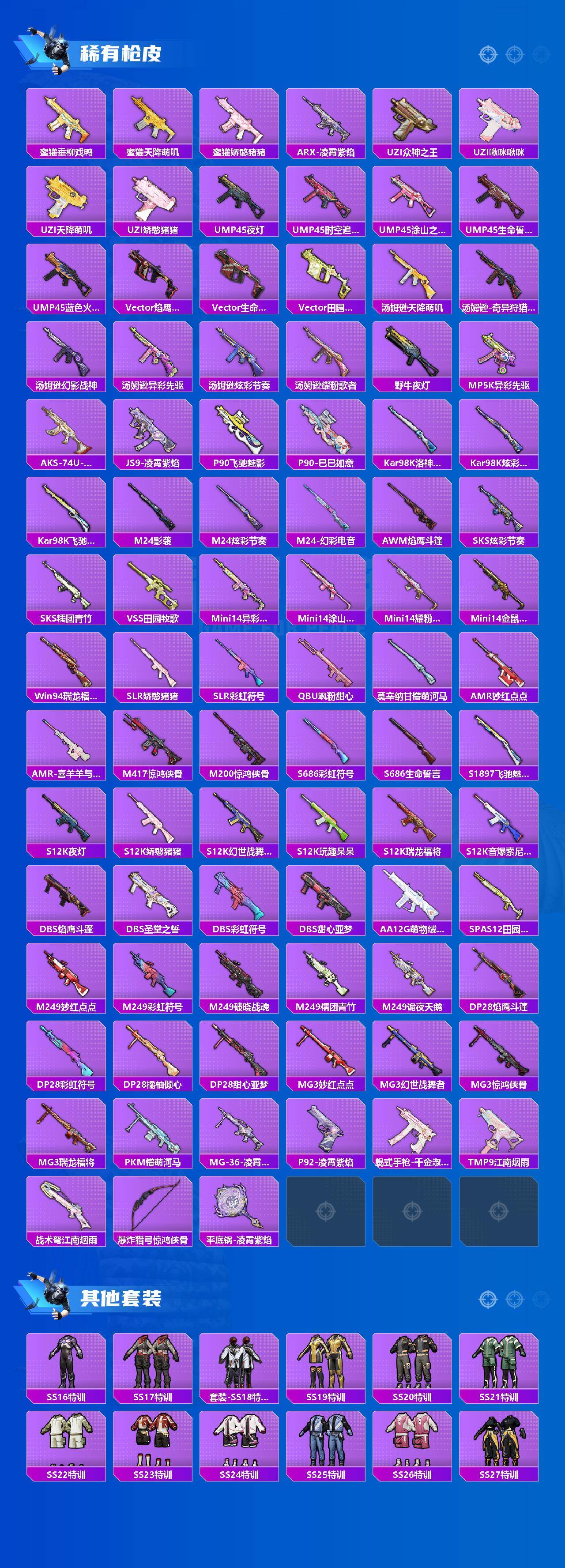 【稀有枪皮】:AKM-冰凉西瓜,AKM-夜灯,AKM-彩虹符号,AKM-江南烟雨,AKM-灼热熔岩,AKM-破晓战魂,AKM-缤纷海域,AKM-萌趣颜团子,AKM-虎虎生威,AKM-霓虹街区,AKM-龙的传人,M16A4-幻世战舞者,M16A4-甜心亚梦,SCAR-L-夜灯,SCAR-L-炫彩节奏,SCAR-L-玉兔迎春,SCAR-L-红色方程式,SCAR-L-小狗蛇点点,M416-动感兔斯基,M416-夜灯,M416-糯团青竹,M416-红色方程式,M416-绯红前夜,M416-蓝色火焰,GROZA-异彩先驱,GROZA-懵萌河马,GROZA-田园牧歌,AUG-天降萌叽,AUG-耀粉歌者,QBZ-未来歌姬,QBZ-洛神天依,QBZ-飞驰魅影,M762-天降萌叽,M762-彩虹符号,M762-瑞龙福将,M762-镭射皇者,Mk47-妙红点点,Mk47-洛神天依,G36C-懵萌河马,AC-VAL-天降萌叽,AC-VAL-彩虹甜喵,AC-VAL-甜心亚梦,蜜獾-垂柳戏
