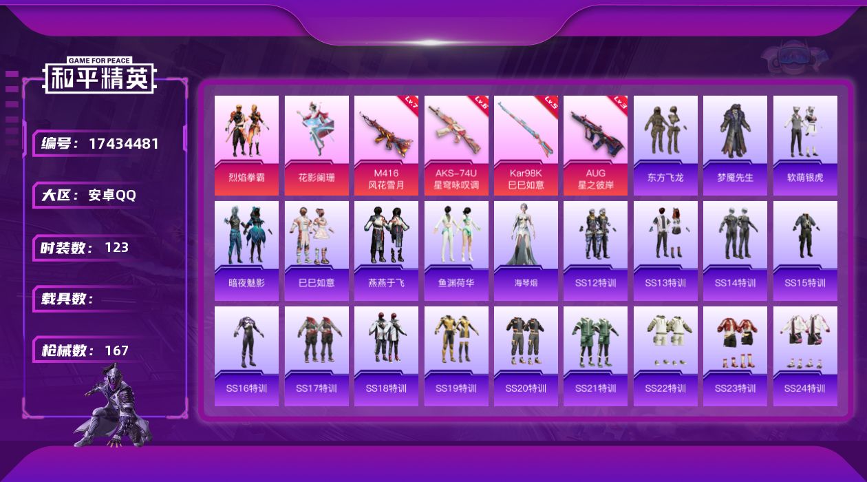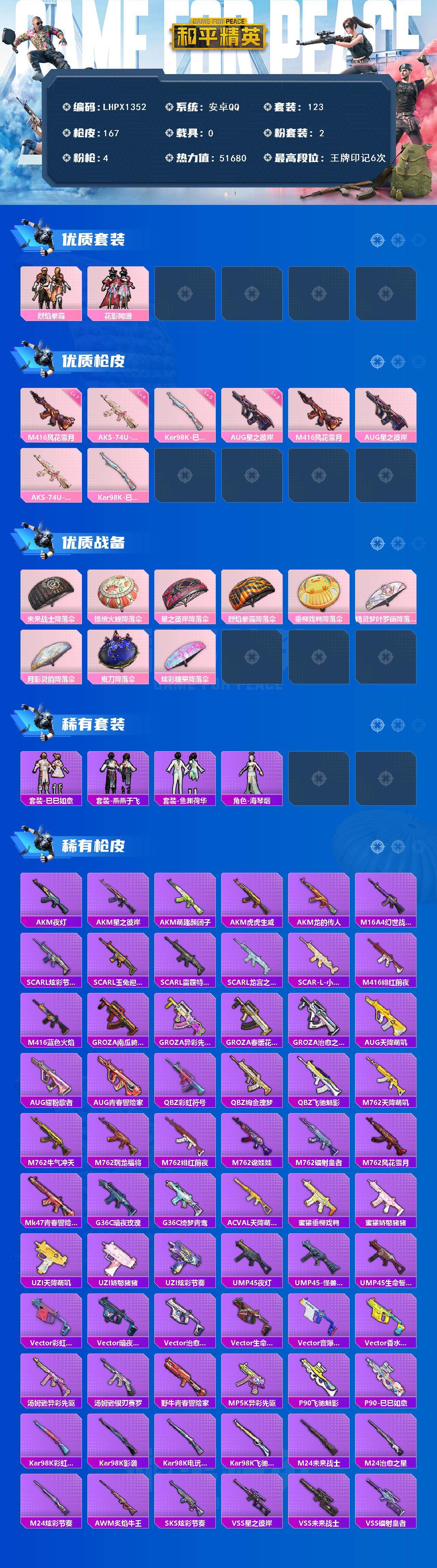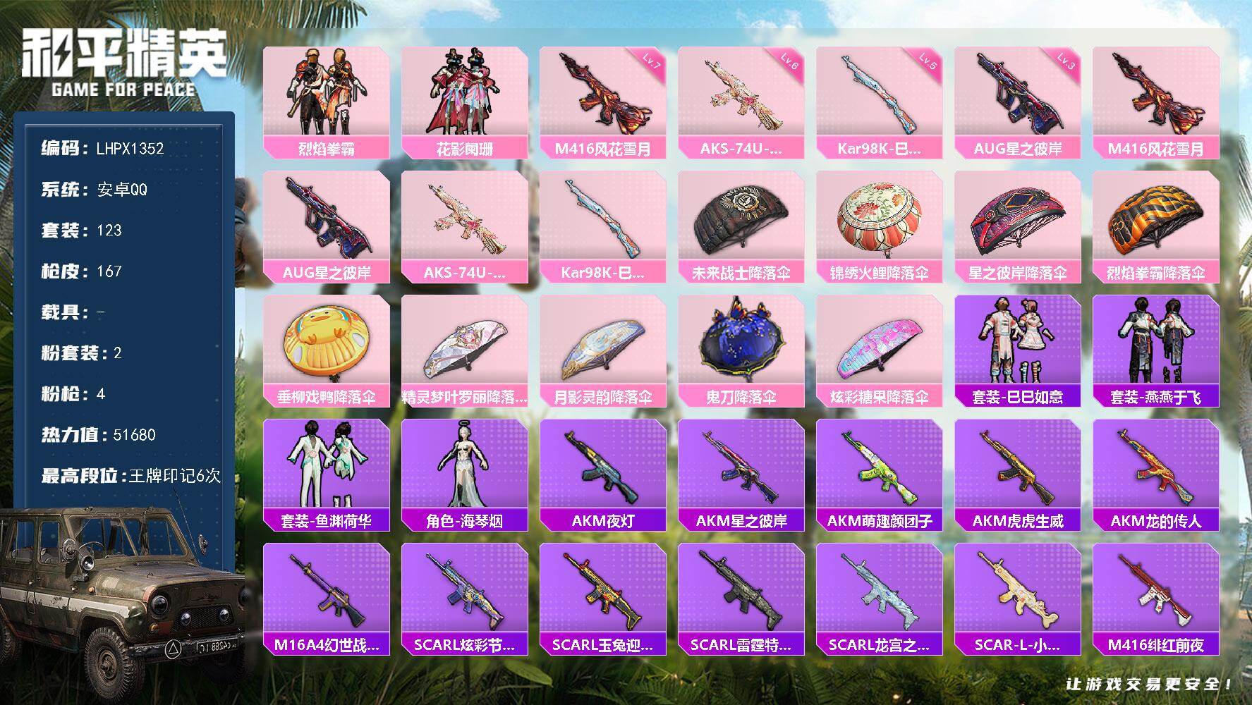 [17434481]【特价出售/店主推荐】安卓 手Q-2粉装-4特效枪-0载具-0粉色飞行器-51680热力值-6王牌印记-123套装-167枪皮 【粉色套装】:粉装-烈焰拳霸,粉装-花影阑珊 【粉色枪皮等级】:M416-风花雪月(七级),AUG-星之彼岸(三级),AKS-74U-星穹咏叹调(六级),Kar98K-巳巳如意(五级) 【粉色枪皮】:M416-风花雪月,AUG-星之彼岸,AKS-74U-星穹咏叹调,Kar98K-巳巳如意 【粉色降落伞】:未来战士降落伞,锦绣火鲤降落伞,星之彼岸降落伞,烈焰拳霸降落伞,垂柳戏鸭降落伞,精灵梦叶罗丽降落伞,月影灵韵降落伞,鬼刀降落伞,炫彩糖果降落伞 【稀有套装】:套装-巳巳如意,套装-燕燕于飞,套装-鱼渊荷华,角色-海琴烟 【稀有枪皮】:AKM-夜灯,AKM-星之彼岸,AKM-萌趣颜团子,AKM-虎虎生威,AKM-龙的传人,M16A4-幻世战舞者,SCAR-L-炫彩节奏,SCAR-L-玉兔迎春,SCAR-L-雷霆特警,SCAR-L-龙宫之主,SCAR-L-小狗蛇点点,M416-绯红前夜,M416-蓝色火焰,GROZA-南瓜骑士,GROZA-异彩先驱,GROZA-春暖花开,GROZA-治愈之星,AUG-天降萌叽,AUG-耀粉歌者,AUG-青春冒险家,QBZ-彩虹符号,QBZ-绚金瑰梦,QBZ-飞驰魅影,M762-天降萌叽,M762-牛气冲天,M762-瑞龙福将,M762-绯红前夜,M762-诡娃娃,M762-镭射皇者,M762-风花雪月,Mk47-青春冒险家,G36C-暗夜玫瑰,G36C-绮梦青鸾,AC-VAL-天降萌叽,蜜獾-垂柳戏鸭,蜜獾-娇憨猪猪,UZI-天降萌叽,UZI-娇憨猪猪,UZI-炫彩节奏,UMP45-夜灯,UMP45-怪兽之王,UMP45-生命誓言,Vector-彩虹符号,Vector-暗夜玫瑰,Vector-治愈之星,Vector-生命誓言,Vector-音爆索尼克,Vector-香水柠檬,汤姆逊-异彩先驱,汤姆逊-银刃赛罗,野牛-青春冒险家,MP5K-异彩先驱,P90-飞驰魅影,P90-巳巳如意,Kar98K-彩虹符号,Kar98K-影袭,Kar98K-电玩视界,Kar98K-飞驰魅影,M24-未来战士,M24-治愈之星,M24-炫彩节奏,AWM-炙焰牛王,SKS-炫彩节奏,VSS-星之彼岸,VSS-未来战士,VSS-镭射