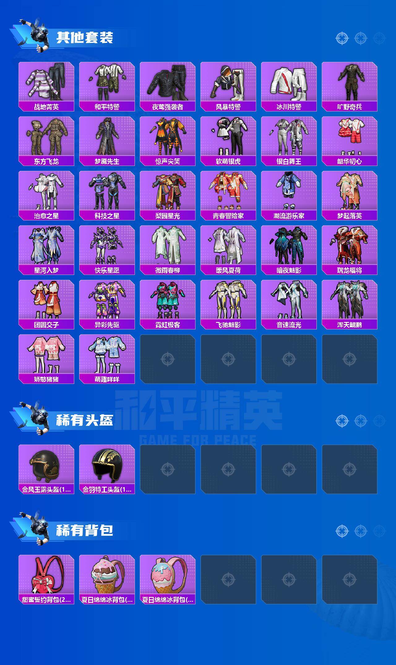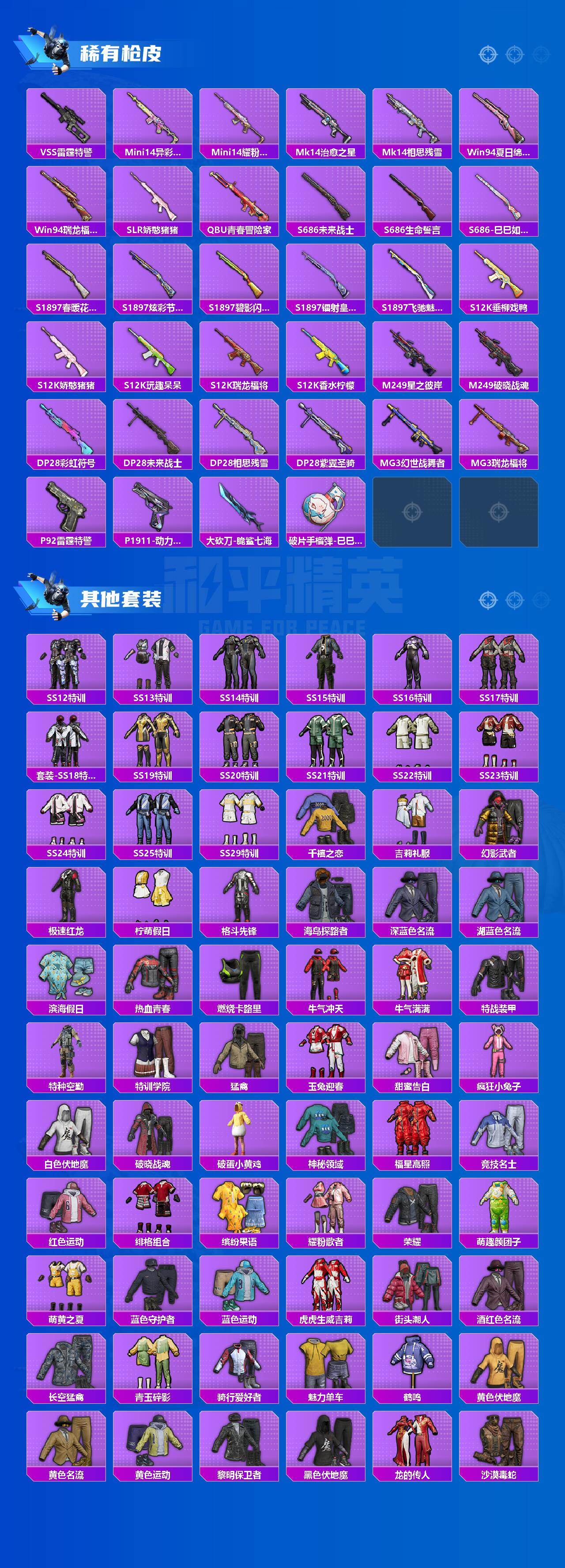 【稀有枪皮】:AKM-夜灯,AKM-星之彼岸,AKM-萌趣颜团子,AKM-虎虎生威,AKM-龙的传人,M16A4-幻世战舞者,SCAR-L-炫彩节奏,SCAR-L-玉兔迎春,SCAR-L-雷霆特警,SCAR-L-龙宫之主,SCAR-L-小狗蛇点点,M416-绯红前夜,M416-蓝色火焰,GROZA-南瓜骑士,GROZA-异彩先驱,GROZA-春暖花开,GROZA-治愈之星,AUG-天降萌叽,AUG-耀粉歌者,AUG-青春冒险家,QBZ-彩虹符号,QBZ-绚金瑰梦,QBZ-飞驰魅影,M762-天降萌叽,M762-牛气冲天,M762-瑞龙福将,M762-绯红前夜,M762-诡娃娃,M762-镭射皇者,M762-风花雪月,Mk47-青春冒险家,G36C-暗夜玫瑰,G36C-绮梦青鸾,AC-VAL-天降萌叽,蜜獾-垂柳戏鸭,蜜獾-娇憨猪猪,UZI-天降萌叽,UZI-娇憨猪猪,UZI-炫彩节奏,UMP45-夜灯,UMP45-怪兽之王,UMP45-生命誓言,Vector-彩虹符号,Vector-暗夜玫瑰,Vector-治愈之星,Vector-生命誓言,Vector-音爆索尼克,Vector-香水柠檬,汤姆逊-异彩先驱,汤姆逊-银刃赛罗,野牛-青春冒险家,MP5K-异彩先驱,P90-飞驰魅影,P90-巳巳如意,Kar98K-彩虹符号,Kar98K-影袭,Kar98K-电玩视界,Kar98K-飞驰魅影,M24-未来战士,M24-治愈之星,M24-炫彩节奏,AWM-炙焰牛王,SKS-炫彩节奏,VSS-星之彼岸,VSS-未来战士,VSS-镭射