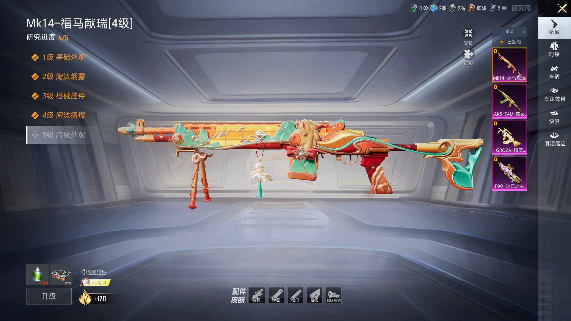 【粉色枪皮等级】:GROZA-精灵之光(三级),AKS-74U-森灵之息(五级),P90-沙丘之主(三级),Mk14-福马献瑞(四级)