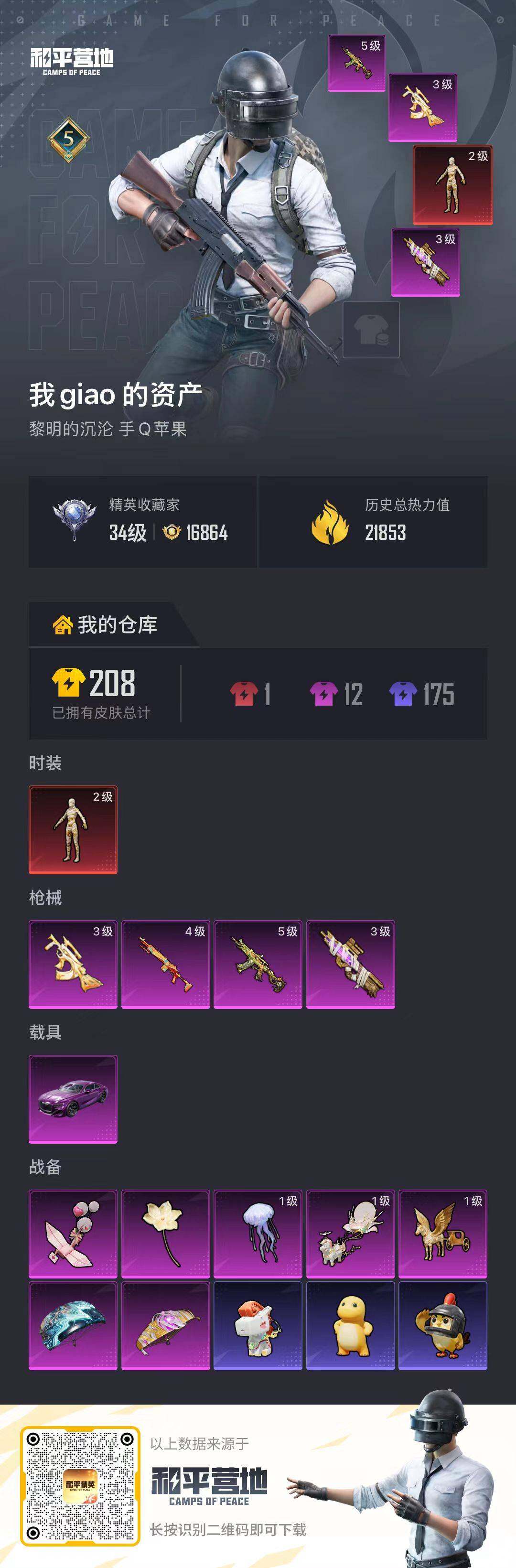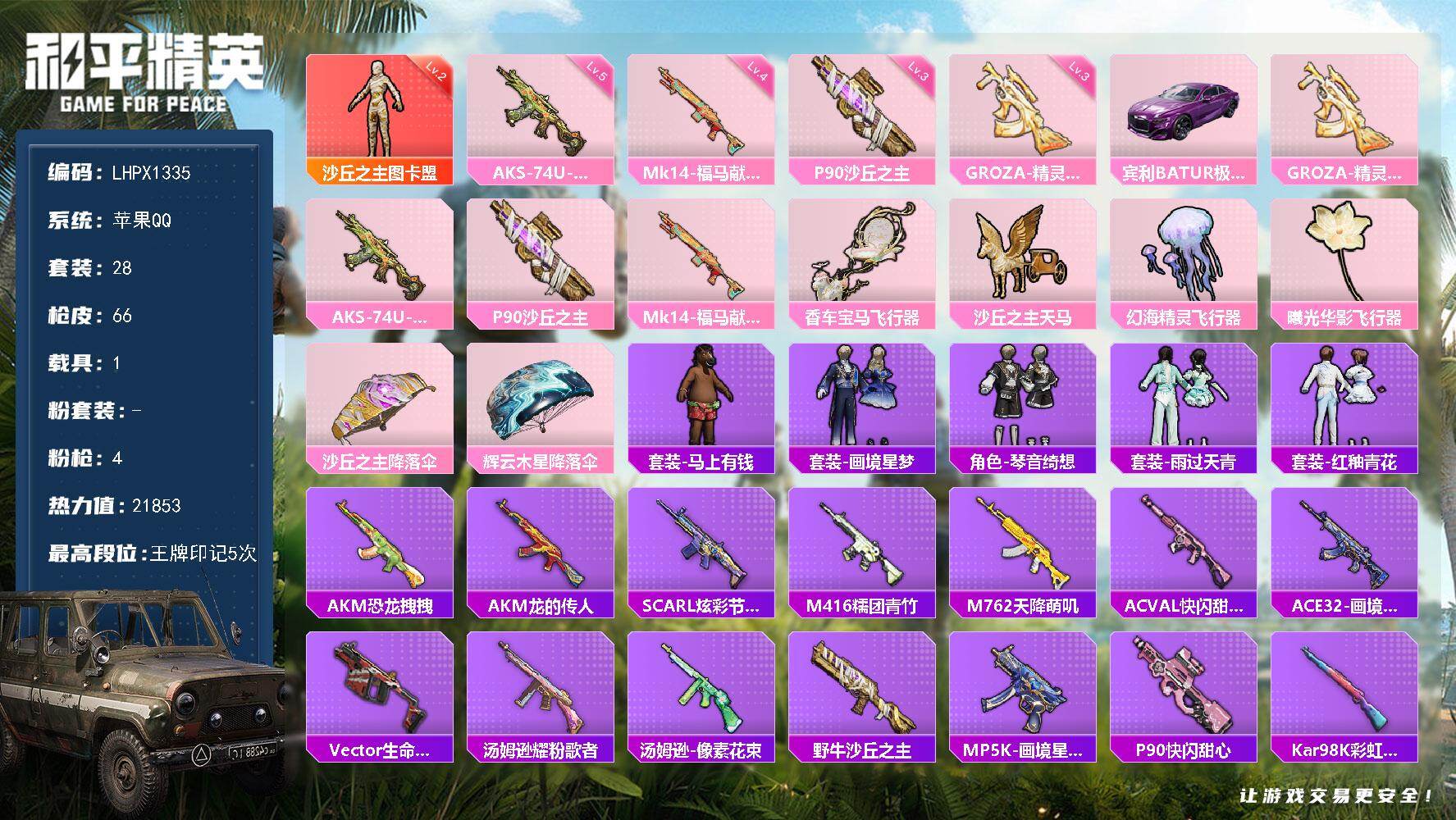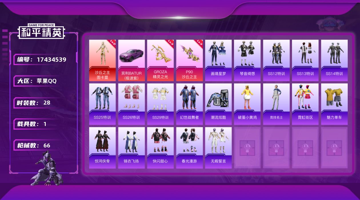 [17434539]可二次【特价出售/店主推荐】苹果 手Q-1神装-0粉装-4特效枪-1载具-5粉色飞行器-21853热力值-5王牌印记-28套装-66枪皮