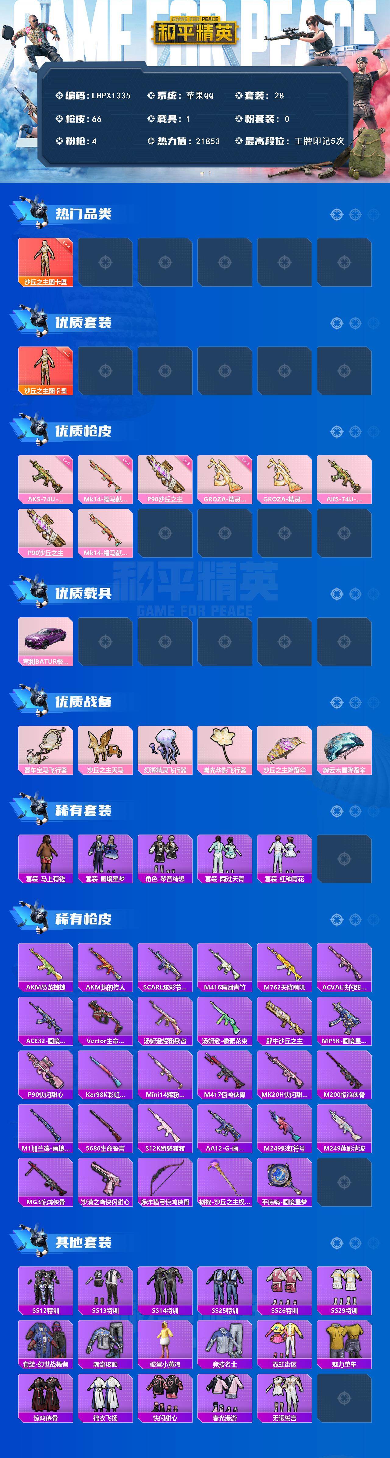 - [17567831]苹果 手Q-6粉装-3特效枪-1载具-0粉色飞行器-55784热力值-6王牌印记-138套装-177枪皮 【热门品类】:套装-浪漫天命,套装-奇异狩猎者,套装-金羽特工,套装-龟仙人,套装-粉红小猪 【粉色套装】:粉装-花间之火,粉装-迷蝶贵族,粉装-冰霜白皇,粉装-炙焰红王,粉装-未来歌姬,角色-绯穹魔姬 【粉色枪皮等级】:M416-至情至圣(九级),Kar98K-巳巳如意(五级),DP-28-豹影疾电(五级) 【粉色载具】:阿斯顿马丁DBS(绿) 【粉色枪皮】:M416-至情至圣,Kar98K-巳巳如意,DP-28-豹影疾电 【粉色降落伞】:快乐主宰降落伞,荧光虫舞降落伞,童趣迷兔降落伞,橘柚倾心降落伞,暖熊萌萌降落伞,旋转彩虹降落伞,未来歌姬降落伞,圣堂之誓降落伞,时空协奏降落伞,千金淑猫降落伞 【稀有套装】:套装-龟仙人,套装-糖糖葫芦,套装-青团波波,套装-棉花软糖,角色-摩登魅猫,角色-海琴烟 【稀有枪皮】:AKM-夜灯,AKM-彩虹符号,AKM-灼热熔岩,AKM-破晓战魂,AKM-萌趣颜团子,AKM-霓虹街区,AKM-龙的传人,M16A4-幻世战舞者,M16A4-甜心亚梦,M16A4-红色方程式,M16A4-千金淑猫,SCAR-L-怪兽之王,SCAR-L-玉兔迎春,M416-月影鸳鸯,M416-糯团青竹,M416-红色方程式,M416-蓝色火焰,GROZA-异彩先驱,GROZA-彩虹符号,GROZA-影袭,GROZA-懵萌河马,GROZA-田园牧歌,AUG-天降萌叽,AUG-耀粉歌者,QBZ-电玩视界,QBZ-飞驰魅影,M762-天降萌叽,M762-彩虹符号,M762-快乐主宰,M762-瑞龙福将,M762-镭射皇者,Mk47-妙红点点,G36C-懵萌河马,G36C-暗夜玫瑰,G36C-炙焰牛王,AC-VAL-天降萌叽,AC-VAL-甜心亚梦,蜜獾-垂柳戏鸭,蜜獾-天降萌叽,蜜獾-娇憨猪猪,UZI-天降萌叽,UZI-娇憨猪猪,UZI-影袭,UZI-炫彩节奏,UMP45-怪兽之王,UMP45-生命誓言,Vector-彩虹符号,Vector-生命誓言,Vector-田园牧歌,汤姆逊-天降萌叽,汤姆逊-异彩先驱,MP5K-异彩先驱,AKS-74U-鬼刀,P90-飞驰魅影,Kar98K-彩虹符号,Kar98K-影袭,Kar98K-王子的夏天,Kar98K-红