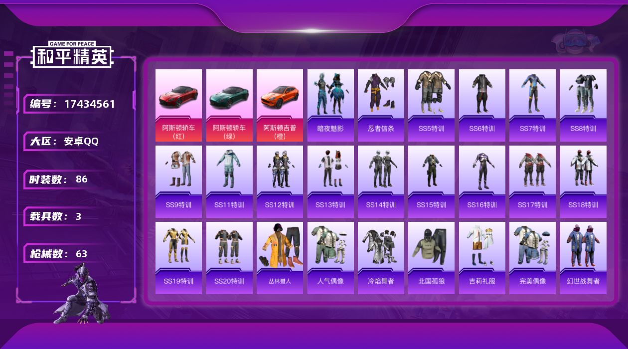 [17434561]可二次【特价出售/店主推荐】安卓 手Q-0粉装-0特效枪-3载具-1粉色飞行器-22807热力值-1王牌印记-86套装-63枪皮 【热门品类】:套装-忍者信条 【粉色载具】:阿斯顿马丁DBS(红),阿斯顿马丁DBS(绿),阿斯顿马丁DBX(橙) 【粉色飞行器】:闪光银龙飞行器 【粉色降落伞】:王牌四分卫降落伞 【稀有枪皮】:AKM-灼热熔岩,AKM-生命誓言,AKM-破晓战魂,AKM-虎虎生威,M16A4-凝视深渊,M16A4-幻世战舞者,M16A4-生命誓言,SCAR-L-暗夜玫瑰,SCAR-L-炫彩节奏,M416-夜灯,M416-红色方程式,M416-蓝色火焰,GROZA-彩虹符号,GROZA-治愈之星,AUG-耀粉歌者,QBZ-彩虹符号,M762-牛气冲天,Mk47-百万伏特,UZI-炫彩节奏,UZI-红色方程式,UMP45-生命誓言,Vector-夜灯,Vector-彩虹符号,Vector-治愈之星,Vector-生命誓言,汤姆逊-炫彩节奏,汤姆逊-耀粉歌者,Kar98K-炫彩节奏,Kar98K-红色方程式,M24-治愈之星,AWM-王牌四分卫,SKS-夜灯,Mini14-生命誓言,Mini14-耀粉歌者,Mk14-治愈之星,S686-红色方程式,S12K-幻世战舞者,M249-破晓战魂,MG3-幻世战舞者,P92-雷霆特警 【其他套装】:套装-SS5特训,套装-SS6特训,套装-SS7特训,套装-SS8特训,套装-SS9特训,套装-SS11特训,套装-SS12特训,套装-SS13特训,套装-SS14特训,套装-SS15特训,套装-SS16特训,套装-SS17特训,套装-SS18特训,套装-SS19特训,套装-SS20特训,套装-丛林猎人,套装-人气偶像,套装-冷焰舞者,套装-北国孤狼,套装-吉莉礼服,套装-完美偶像,套装-幻世战舞者,套装-幻影武者,套装-战地督导,套装-探宝勇士,套装-极速红龙,套装-棕色飞行服,套装-橘黑制服,套装-沙漠兵团,套装-海滨突袭者,套装-深蓝色名流,套装-游猎者,套装-湖蓝色名流,套装-滨海假日,套装-灼焰舞者,套装-炫蓝之夏,套装-热血青春,套装-牛气满满,套装-特殊使命,套装-特训学院,套装-猎鹰,套装-猛禽,套装-甜蜜告白,套装-甜蜜熊情侣,套装-疯狂小兔子,套装-白色伏地魔,套装-破晓战魂,套装-破蛋小黄鸡,套装-