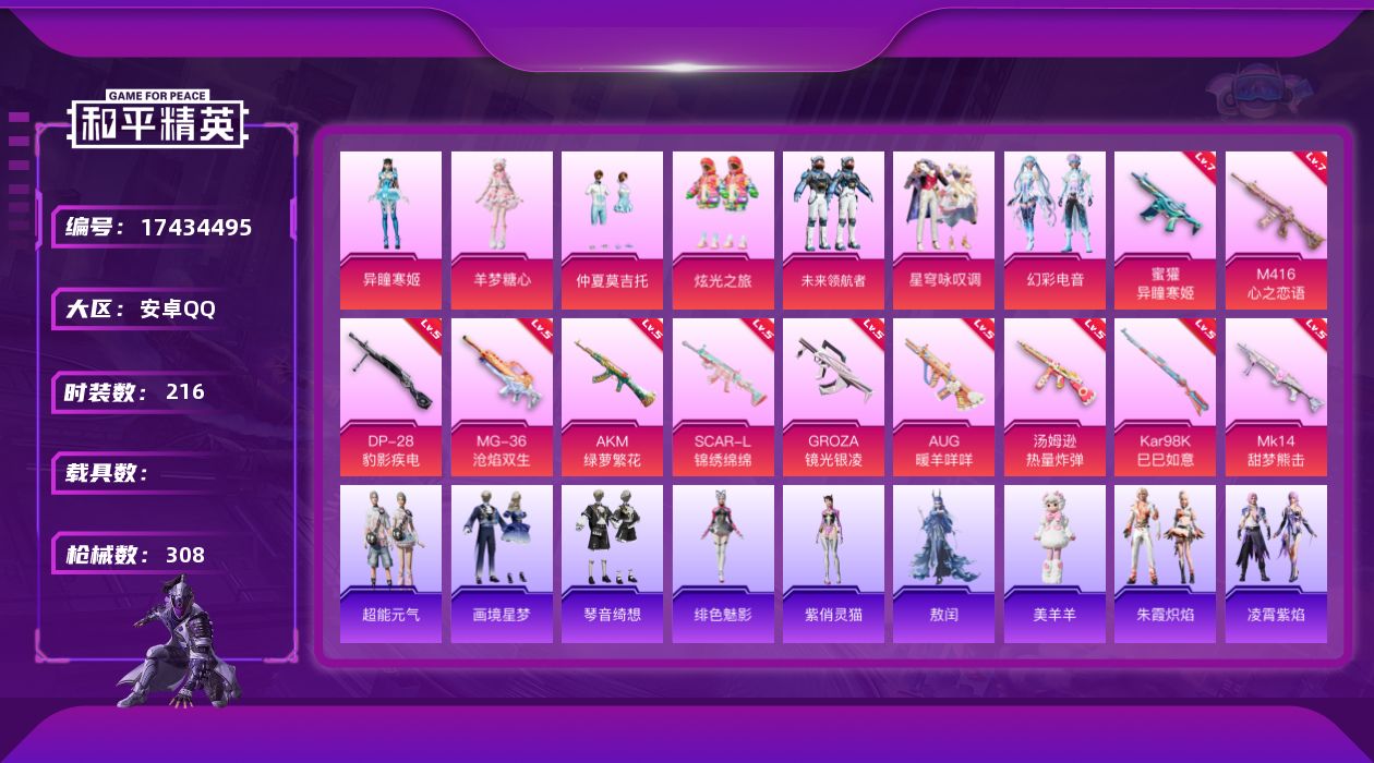 [17434495]安卓 手Q-7粉装-14特效枪-0载具-3粉色飞行器-97652热力值-12王牌印记-216套装-308枪皮