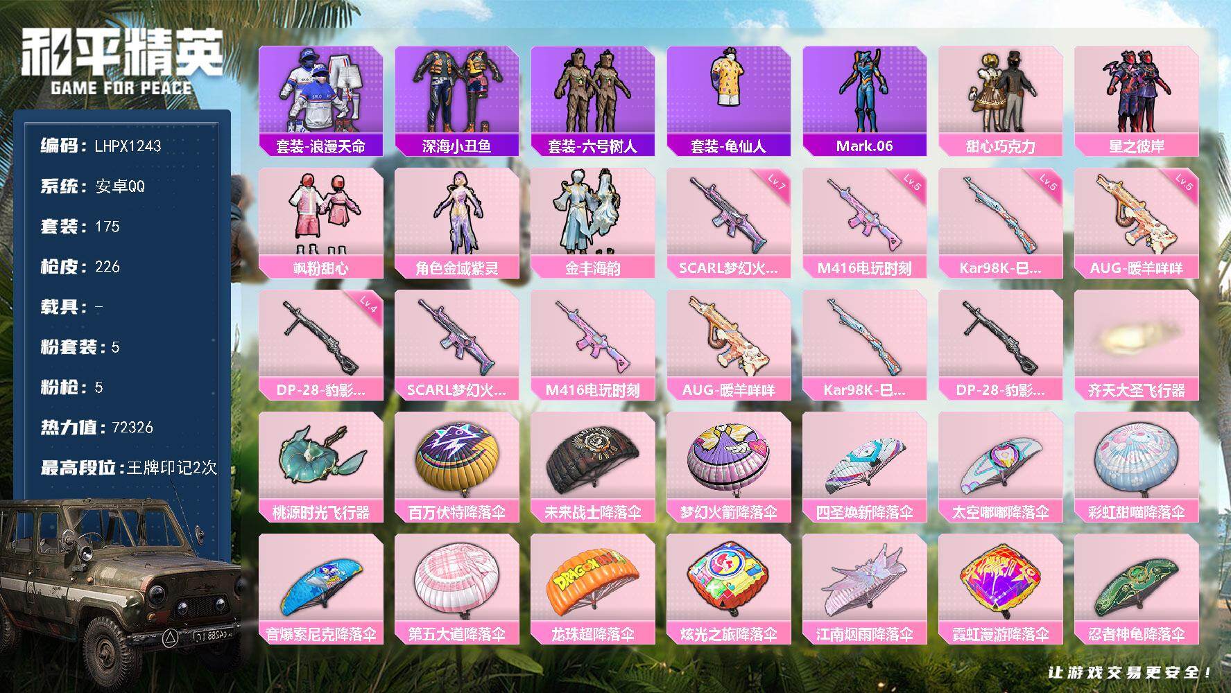 [17434732]可二次【特价出售/店主推荐】安卓 手Q-5粉装-5特效枪-0载具-2粉色飞行器-72326热力值-2王牌印记-175套装-226枪皮 【热门品类】:套装-浪漫天命,套装-深海小丑鱼,套装-六号树人,套装-龟仙人,角色-Mark.06 【粉色套装】:粉装-甜心巧克力,粉装-星之彼岸,粉装-飒粉甜心,角色-金域紫灵,粉装-金丰海韵 【粉色枪皮等级】:SCAR-L-梦幻火箭(七级),M416-电玩时刻(五级),AUG-暖羊咩咩(五级),Kar98K-巳巳如意(五级),DP-28-豹影疾电(四级) 【粉色枪皮】:SCAR-L-梦幻火箭,M416-电玩时刻,AUG-暖羊咩咩,Kar98K-巳巳如意,DP-28-豹影疾电 【粉色飞行器】:齐天大圣飞行器,桃源时光飞行器 【粉色降落伞】:百万伏特降落伞,未来战士降落伞,梦幻火箭降落伞,四圣焕新降落伞,太空嘟嘟降落伞,彩虹甜喵降落伞,音爆索尼克降落伞,第五大道降落伞,龙珠超降落伞,炫光之旅降落伞,江南烟雨降落伞,霓虹漫游降落伞,忍者神龟降落伞,临安公主降落伞,星穹咏叹调降落伞,幻彩电音降落伞 【稀有套装】:套装-龟仙人,套装-小鸟芋圆,套装-雏菊兔兔,套装-萝兰蝴蝶,套装-小熊娃娃,套装-火种守卫者,套装-燕燕于飞,套装-鱼渊荷华,套装-闪电轻猫,角色-夜瞳黯灵 【稀有枪皮】:AKM-夜灯,AKM-奇异狩猎者,AKM-彩虹符号,AKM-影袭,AKM-玉龙,AKM-环太平洋,AKM-生命誓言,AKM-破晓战魂,AKM-萌趣颜团子,AKM-虎虎生威,AKM-霓虹街区,AKM-龙的传人,AKM-玄冥寒域,M16A4-红色方程式,M16A4-蓝色火焰,SCAR-L-炫彩节奏,SCAR-L-玉兔迎春,SCAR-L-粉锦千层,SCAR-L-红色方程式,SCAR-L-银碳小老虎,M416-夜灯,M416-滑板小狐,M416-糯团青竹,M416-红色方程式,M416-绯红前夜,M416-罗小黑,M416-蓝色火焰,M416-黄金狮王,GROZA-影袭,GROZA-懵萌河马,GROZA-治愈之星,GROZA-田园牧歌,AUG-2P战斗服款,AUG-天降萌叽,AUG-耀粉歌者,QBZ-原初圣火,M762-天星战神,M762-天降萌叽,M762-牛气冲天,M762-绯红前夜,M762-萌物绒绒,M762-诡娃娃,M762-镭射皇者,Mk47-妙红点点,