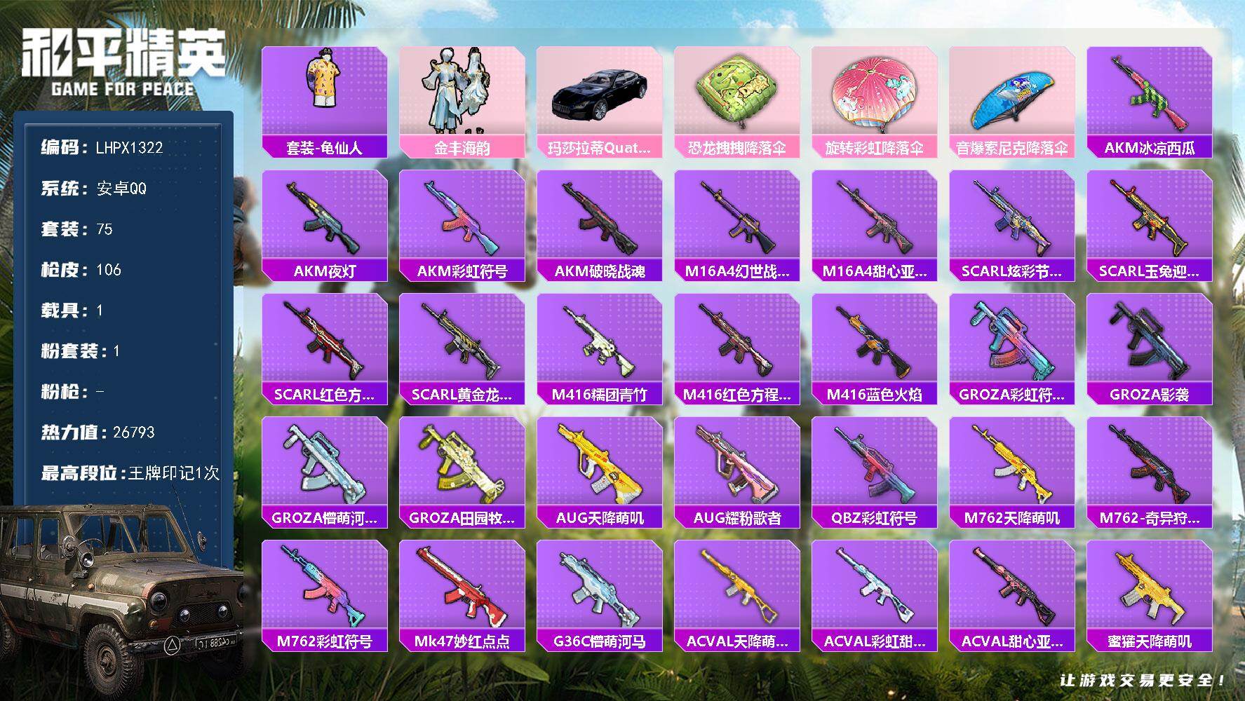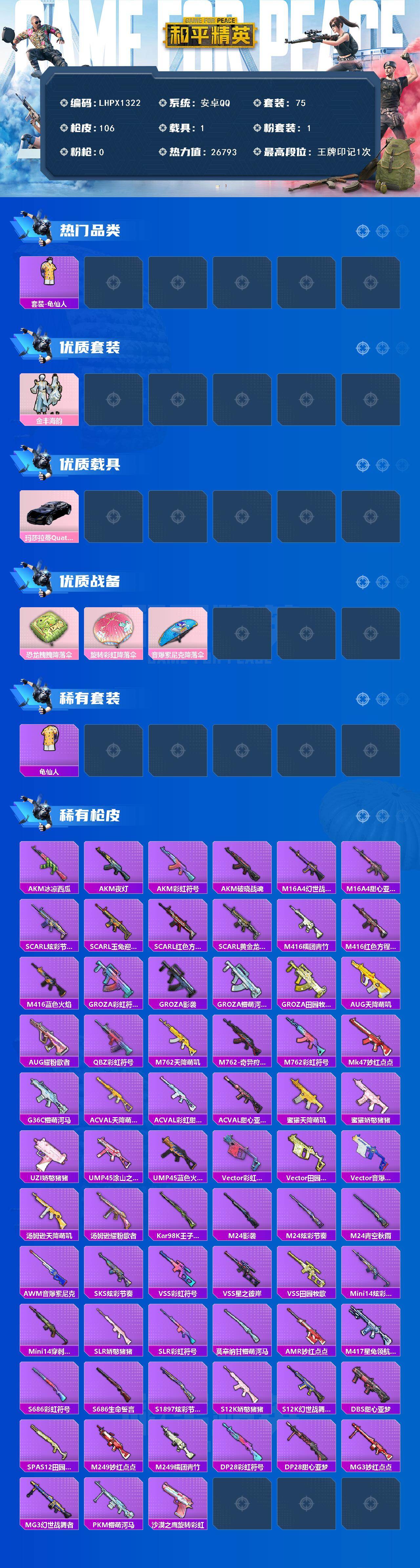 [17434583]可二次【特价出售/店主推荐】安卓 手Q-1粉装-0特效枪-1载具-0粉色飞行器-26793热力值-1王牌印记-75套装-106枪皮 【热门品类】:套装-龟仙人 【粉色套装】:粉装-金丰海韵 【粉色载具】:玛莎拉蒂Quattroporte(夜幕蓝) 【粉色降落伞】:恐龙拽拽降落伞,旋转彩虹降落伞,音爆索尼克降落伞 【稀有套装】:套装-龟仙人 【稀有枪皮】:AKM-冰凉西瓜,AKM-夜灯,AKM-彩虹符号,AKM-破晓战魂,M16A4-幻世战舞者,M16A4-甜心亚梦,SCAR-L-炫彩节奏,SCAR-L-玉兔迎春,SCAR-L-红色方程式,SCAR-L-黄金龙骨,M416-糯团青竹,M416-红色方程式,M416-蓝色火焰,GROZA-彩虹符号,GROZA-影袭,GROZA-懵萌河马,GROZA-田园牧歌,AUG-天降萌叽,AUG-耀粉歌者,QBZ-彩虹符号,M762-天降萌叽,M762-奇异狩猎者,M762-彩虹符号,Mk47-妙红点点,G36C-懵萌河马,AC-VAL-天降萌叽,AC-VAL-彩虹甜喵,AC-VAL-甜心亚梦,蜜獾-天降萌叽,蜜獾-娇憨猪猪,UZI-娇憨猪猪,UMP45-涂山之恋,UMP45-蓝色火焰,Vector-彩虹符号,Vector-田园牧歌,Vector-音爆索尼克,汤姆逊-天降萌叽,汤姆逊-耀粉歌者,Kar98K-王子的夏天,M24-影袭,M24-炫彩节奏,M24-青空秋雨,AWM-音爆索尼克,SKS-炫彩节奏,VSS-彩虹符号,VSS-星之彼岸,VSS-田园牧歌,Mini14-炫彩节奏,Mini14-穿刺龙虾,SLR-娇憨猪猪,SLR-彩虹符号,莫辛纳甘-懵萌河马,AMR-妙红点点,M417-星兔领航员,S686-彩虹符号,S686-生命誓言,S1897-炫彩节奏,S12K-娇憨猪猪,S12K-幻世战舞者,DBS-甜心亚梦,SPAS-12-田园牧歌,M249-妙红点点,M249-糯团青竹,DP-28-彩虹符号,DP-28-甜心亚梦,MG3-妙红点点,MG3-幻世战舞者,PKM-懵萌河马,沙漠之鹰-旋转彩虹 【其他套装】:套装-SS19特训,套装-SS20特训,套装-SS21特训,套装-SS22特训,套装-SS23特训,套装-SS24特训,套装-SS29特训,套装-光之冒险,套装-冷焰舞者,套装-幻世战舞者,套装-幻影武者,套装-战地督