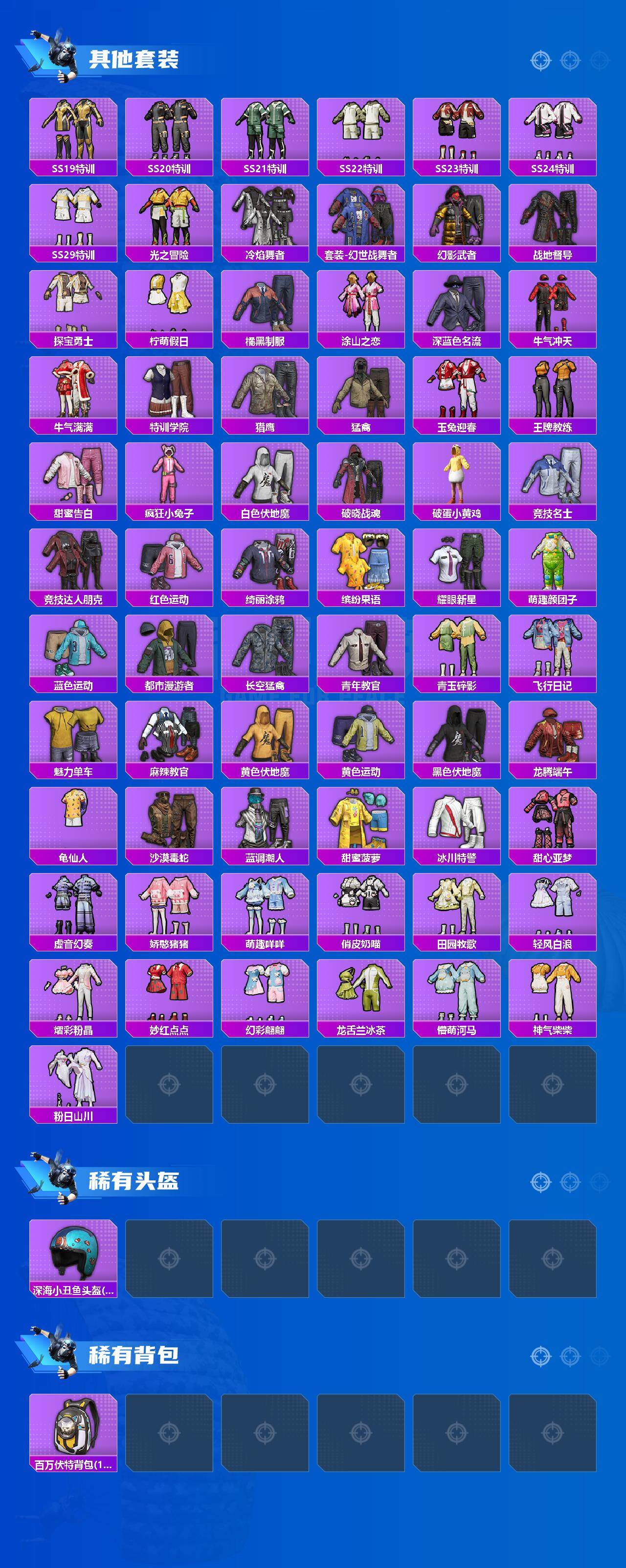 【其他套装】:套装-SS19特训,套装-SS20特训,套装-SS21特训,套装-SS22特训,套装-SS23特训,套装-SS24特训,套装-SS29特训,套装-光之冒险,套装-冷焰舞者,套装-幻世战舞者,套装-幻影武者,套装-战地督