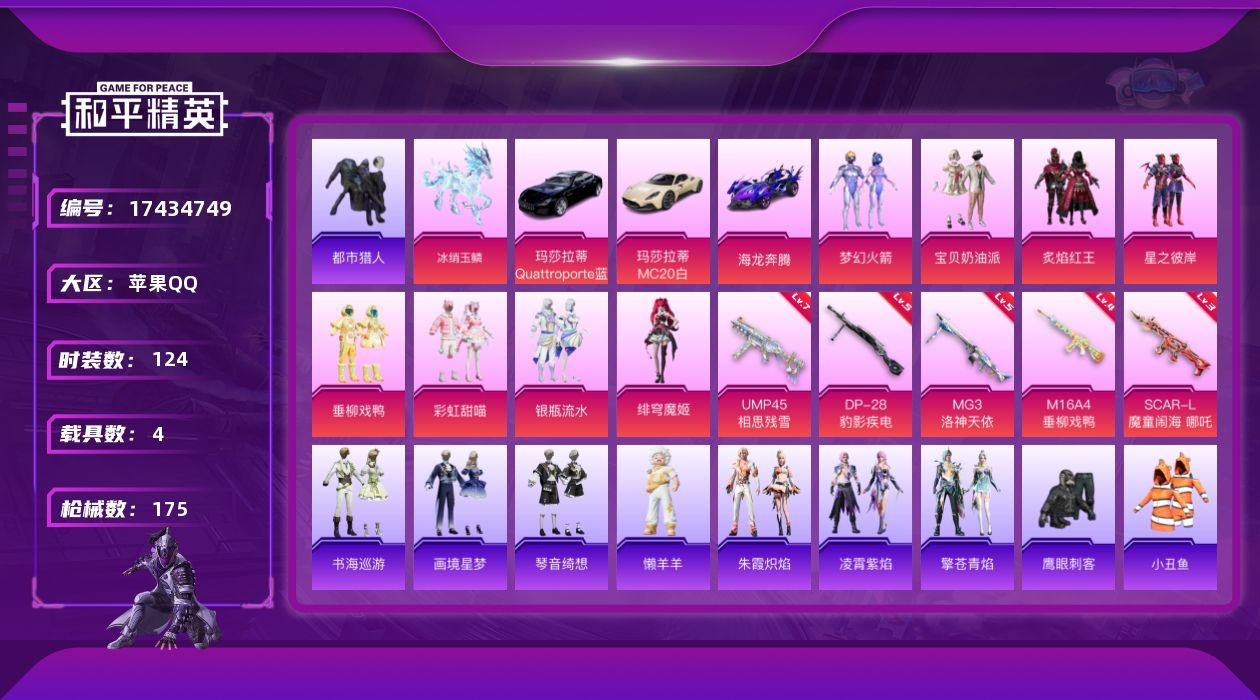 [17434749]苹果 手Q-9粉装-8特效枪-4载具-2粉色飞行器-58580热力值-9王牌印记-124套装-175枪皮 【热门品类】:粉装-梦幻火箭,套装-都市猎人,套装-小丑鱼,套装-龟仙人 【粉色套装】:粉装-宝贝奶油派,粉装-梦幻火箭,粉装-炙焰红王,粉装-星之彼岸,粉装-垂柳戏鸭,粉装-彩虹甜喵,粉装-银瓶流水,角色-绯穹魔姬,角色-罪夜之冕 【粉色枪皮等级】:M16A4-垂柳戏鸭(四级),SCAR-L-魔童闹海 哪吒(三级),UMP45-相思残雪(七级),AKS-74U-森灵之息(五级),Mk14-福马献瑞(五级),DP-28-豹影疾电(五级),MG3-洛神天依(五级),信号枪-金乌曜日(四级) 【粉色载具】:玛莎拉蒂MC20(星石白),玛莎拉蒂Quattroporte(夜幕蓝),海龙奔腾,冰绡玉鳞 【粉色枪皮】:M16A4-垂柳戏鸭,SCAR-L-魔童闹海 哪吒,UMP45-相思残雪,AKS-74U-森灵之息,Mk14-福马献瑞,DP-28-豹影疾电,MG3-洛神天依,信号枪-金乌曜日 【粉色飞行器】:炫彩糖果飞行器,灵珠游龙飞行器 【粉色降落伞】:百万伏特降落伞,甜心宝贝降落伞,梦幻火箭降落伞,相思残雪降落伞,暗夜玫瑰降落伞,洛神天依降落伞,绿意幻情降落伞,环太平洋降落伞,垂柳戏鸭降落伞,翩跹演武降落伞,太空嘟嘟降落伞,海螺星光降落伞,音爆索尼克降落伞,绯穹魔姬降落伞,魔童闹海 敖丙降落伞,炫彩糖果降落伞 【稀有套装】:套装-龟仙人,套装-雪国风尚,套装-炫彩糖果,套装-马上有钱,套装-极速光影,套装-彩虹兔,套装-云朵鹅,套装-雪绒豹,套装-朱霞炽焰,套装-凌霄紫焰,套装-擎苍青焰,玩偶服-懒羊羊,套装-书海巡游,套装-画境星梦,套装-琴音绮想,角色-月烬之祷 【稀有枪皮】:AUG-冰晶雪宝,AKM-影袭,AKM-海渊国主,AKM-环太平洋,AKM-生命誓言,AKM-虎虎生威,AKM-龙的传人,AKM-灵猫魔法师,M16A4-甜心亚梦,SCAR-L-玉兔迎春,SCAR-L-甜蜜誓约,SCAR-L-龙宫之主,M416-神秘黑猫,M416-糯团青竹,M416-红色方程式,M416-蓝色火焰,GROZA-异彩先驱,GROZA-影袭,GROZA-甜蜜草莓,GROZA-田园牧歌,GROZA-暮色玫影,AUG-圣光天使,AUG-天降萌叽,AUG-耀粉歌者,QBZ-洛神天依,