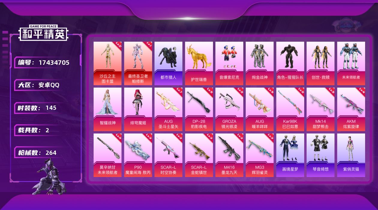 [17434705]【特价出售/店主推荐】安卓 手Q-2神装-7粉装-16特效枪-2载具-10粉色飞行器-82536热力值-14王牌印记-145套装-264枪皮