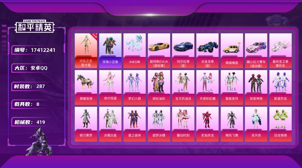 [17412241]安卓 手Q-2神装-34粉装-21特效枪-8载具-19粉色飞行器-160423热力值-21王牌印记-287套装-419枪皮