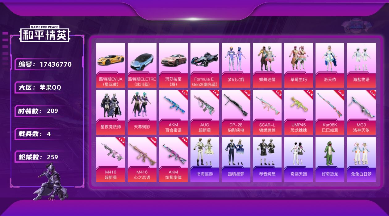 - [17538813]苹果 手Q-2神装-7粉装-10特效枪-2载具-3粉色飞行器-42995热力值-6王牌印记-85套装-115枪皮 【红色神装等级】:魔童闹海-哪吒(二级),灵猫魔法师-塞维尔(一级) 【红色角色神装】:魔童闹海-哪吒,灵猫魔法师-塞维尔 【热门品类】:粉装-雪国幻梦,粉装-缤纷油彩,套装-寒蝎幽灵,套装-派对舞王,套装-潮萌小黄鸭,套装-糯粉咩咩,套装-红熊茄茄 【粉色套装】:粉装-雪国幻梦,粉装-静灵氛围,粉装-智能音符,粉装-缤纷油彩,粉装-冰霜白皇,粉装-仲夏莫吉托,粉装-幻彩电音 【粉色枪皮等级】:SCAR-L-纯梦嫁纱(四级),M416-灵猫魔法师(三级),AUG-花中眠(三级),ACE32-萌骑漫游(四级),P90-甜蜜草莓(五级),Kar98K-巳巳如意(五级),Mk14-福马献瑞(五级),MK12-雪月幻音(一级),DP-28-豹影疾电(五级),破片手榴弹-美味星星糖(七级) 【粉色载具】:黑曜夜骑,冰绡玉鳞 【粉色枪皮】:SCAR-L-纯梦嫁纱,M416-灵猫魔法师,AUG-花中眠,ACE32-萌骑漫游,P90-甜蜜草莓,Kar98K-巳巳如意,Mk14-福马献瑞,MK12-雪月幻音,DP-28-豹影疾电,破片手榴弹-美味星星糖 【粉色飞行器】:戏水时光飞行器,灵猫魔法师飞行器 【粉色降落伞】:仲夏莫吉托降落伞,蜜语绒猫降落伞,智耀战神降落伞,冷漠罗丽降落伞,灵猫魔法师降落伞,喜羊羊与灰太狼降落伞,罪夜之冕降落伞 【稀有套装】:套装-巳巳如意,套装-小鸟芋圆,套装-雪国风尚,套装-马上有钱,套装-燕燕于飞,套装-鱼渊荷华,玩偶服-小狗蛇点点,套装-晶辉守护,套装-粉恋花,套装-紫幽梦,套装-蓝冰羽,套装-果冻柠檬,套装-星渊小夜曲,套装-极速光影,套装-彩虹兔,套装-云朵鹅,套装-雪绒豹,套装-诡诞巡游,角色-时希公主,套装-蓝海鲸歌,套装-朱霞炽焰,套装-凌霄紫焰,套装-擎苍青焰,套装-雨过天青,套装-红釉青花,玩偶服-会说话的汤姆猫 【稀有枪皮】:M79短管榴弹-钛晶裂爪,AKM-灵猫魔法师,M16A4-绒绒猫尾,SCAR-L-小狗蛇点点,GROZA-影袭,AUG-甜蜜菠萝,QBZ-绒兔团圆,M762-云朵鹅,G36C-星穹咏叹调,ARX-凌霄紫焰,UZI-啾咪啾咪,UZI-影袭,汤姆逊-灵猫魔法师,汤姆逊-绒绒猫尾,AKS-74U-辉羽雀灵