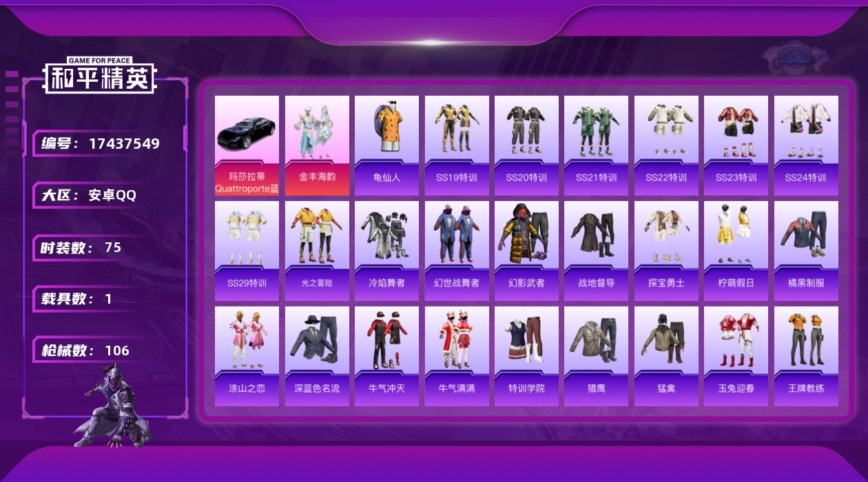 [17437549]可二次【特价出售/店主推荐】安卓 手Q-1粉装-0特效枪-1载具-0粉色飞行器-26793热力值-1王牌印记-75套装-106枪皮 【热门品类】:套装-龟仙人 【粉色套装】:粉装-金丰海韵 【粉色载具】:玛莎拉蒂Quattroporte(夜幕蓝) 【粉色降落伞】:恐龙拽拽降落伞,旋转彩虹降落伞,音爆索尼克降落伞 【稀有套装】:套装-龟仙人 【稀有枪皮】:AKM-冰凉西瓜,AKM-夜灯,AKM-彩虹符号,AKM-破晓战魂,M16A4-幻世战舞者,M16A4-甜心亚梦,SCAR-L-炫彩节奏,SCAR-L-玉兔迎春,SCAR-L-红色方程式,SCAR-L-黄金龙骨,M416-糯团青竹,M416-红色方程式,M416-蓝色火焰,GROZA-彩虹符号,GROZA-影袭,GROZA-懵萌河马,GROZA-田园牧歌,AUG-天降萌叽,AUG-耀粉歌者,QBZ-彩虹符号,M762-天降萌叽,M762-奇异狩猎者,M762-彩虹符号,Mk47-妙红点点,G36C-懵萌河马,AC-VAL-天降萌叽,AC-VAL-彩虹甜喵,AC-VAL-甜心亚梦,蜜獾-天降萌叽,蜜獾-娇憨猪猪,UZI-娇憨猪猪,UMP45-涂山之恋,UMP45-蓝色火焰,Vector-彩虹符号,Vector-田园牧歌,Vector-音爆索尼克,汤姆逊-天降萌叽,汤姆逊-耀粉歌者,Kar98K-王子的夏天,M24-影袭,M24-炫彩节奏,M24-青空秋雨,AWM-音爆索尼克,SKS-炫彩节奏,VSS-彩虹符号,VSS-星之彼岸,VSS-田园牧歌,Mini14-炫彩节奏,Mini14-穿刺龙虾,SLR-娇憨猪猪,SLR-彩虹符号,莫辛纳甘-懵萌河马,AMR-妙红点点,M417-星兔领航员,S686-彩虹符号,S686-生命誓言,S1897-炫彩节奏,S12K-娇憨猪猪,S12K-幻世战舞者,DBS-甜心亚梦,SPAS-12-田园牧歌,M249-妙红点点,M249-糯团青竹,DP-28-彩虹符号,DP-28-甜心亚梦,MG3-妙红点点,MG3-幻世战舞者,PKM-懵萌河马,沙漠之鹰-旋转彩虹 【其他套装】:套装-SS19特训,套装-SS20特训,套装-SS21特训,套装-SS22特训,套装-SS23特训,套装-SS24特训,套装-SS29特训,套装-光之冒险,套装-冷焰舞者,套装-幻世战舞者,套装-幻影武者,套装-战地督