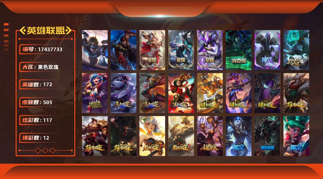 [17437733]大师段位-172英雄-505皮肤-117炫彩-2终极-10神话-93限定-60传说-114史诗