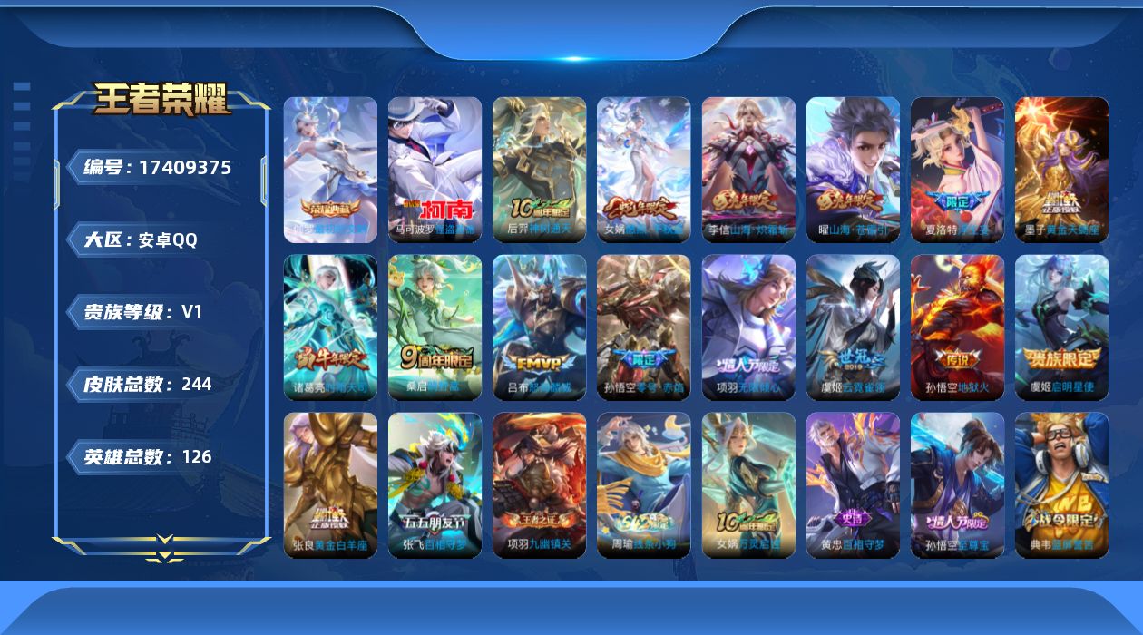 [17409375]可二次【特价出售/店主推荐/1省标/4市标/34段中路】:安卓Q-V8-最强王者段位-126英雄-244皮肤-1典藏皮肤-1珍品传说-16传说-67史诗 【英雄全皮】:海诺全皮 【荣耀典藏】:伽罗最初的交响 【珍品传说】:马可波罗怪盗基德 【传说皮肤】:后羿神树通天,女娲愿照千秋盛,桑启鸣野蒿,墨子黄金天蝎座,张飞百相守梦,夏洛特浮生妄,项羽无限倾心,曜山海苍雷引,李信山海炽霜斩,吕布怒海麟威,诸葛亮时雨天司,虞姬启明星使,孙悟空零号赤焰,张良黄金白羊座,虞姬云霓雀翎,孙悟空地狱火 【限定皮肤】:蒙犽顽岩魄,姜子牙天穹之誓,狄仁杰阴阳师,赵云皇家上将,墨子神迹守卫,妲己时之彼端,嬴政白昼王子,孙尚香蔷薇恋人,鲁班七号狮舞东方,高渐离玩趣恶龙,阿轲迷踪丽影,吕布猎兽之王,夏侯惇朔风刀,典韦蓝屏警告,马可波罗山海玄木吟,狄仁杰魔术师,狄仁杰万华元夜,达摩沙漠行僧,项羽海滩派对,项羽无限倾心,老夫子醍醐杖,老夫子航海奇遇记,程咬金演武夺筹,刘邦夺宝奇兵,韩信飞衡,兰陵王金庭之子,孙悟空至尊宝,孙悟空大圣娶亲,孙悟空零号赤焰,牛魔御旌,牛魔奔雷神使,后羿如梦令,后羿圣弓游侠,张飞百相守梦,李元芳银河之约,李元芳云中旅人,虞姬启明星使,钟馗神迹守卫,钟馗驱傩正仪,杨玉环遇见飞天,女娲朔望之晖,干将莫邪冰霜恋舞曲,干将莫邪真爱魔法,雅典娜单词大作战,蔡文姬繁星吟游,鬼谷子原初探秘者,诸葛亮时雨天司,黄忠烈魂,苏烈千军破阵,百里守约朱雀志,弈星混沌棋,梦奇顽趣,沈梦溪星空之诺,沈梦溪大漠名商,明世隐疑决卦,裴擒虎李小龙,裴擒虎擒涛扼浪,米莱狄御霄,云中君纤云弄巧,李信山海炽霜斩,盾山御銮,嫦娥拒霜思,曜山海苍雷引,蒙犽狂想玩偶喵,鲁班大师探海日志,桑启海盐诗旅,夏洛特浮生妄,阿古朵江河有灵,张良古海寻踪,蒙恬荣光圣徽,鬼谷子天穹祈灯,刘邦剑破天穹,海诺心动手记,周瑜熔金海岸 【年限皮肤】:百里守约朱雀志,韩信飞衡,诸葛亮时雨天司,牛魔奔雷神使,曜山海苍雷引,李信山海炽霜斩,马可波罗山海玄木吟,女娲愿照千秋盛 【赛季限定】:米莱狄御霄,牛魔御旌,盾山御銮,夏侯惇朔风刀,弈星混沌棋,明世隐疑决卦,老夫子醍醐杖,鬼谷子原初探秘者,狄仁杰万华元夜,程咬金演武夺筹,钟馗驱傩正仪,苏烈千军破阵,达摩沙漠行僧,兰陵王金庭之子,沈梦溪大漠名商,李元芳云中旅人,桑启海盐诗旅,裴擒虎擒涛扼浪,鲁班