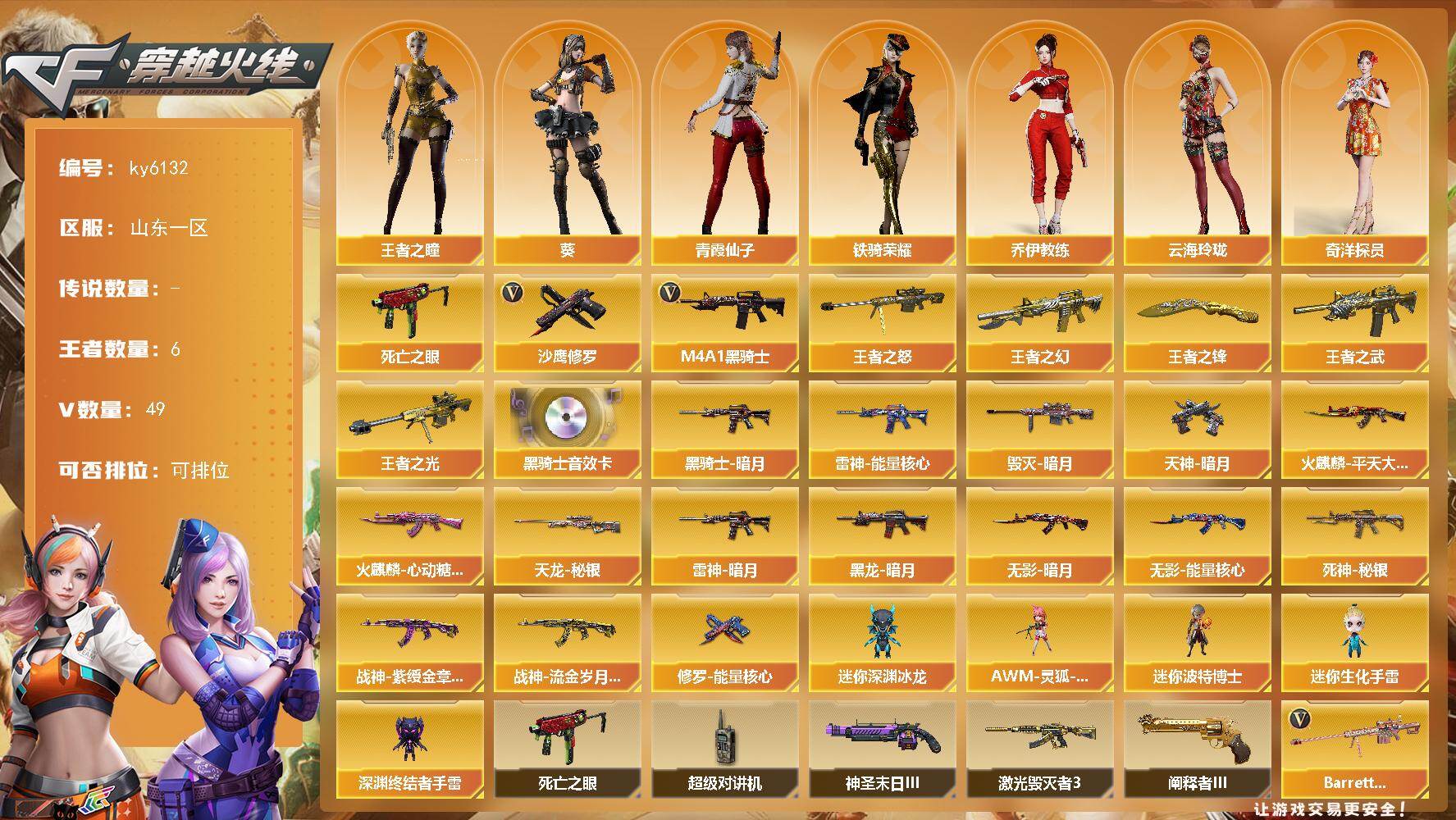 [17426213]【ky6132】山东一区-50V-6王者武器数-0炫金武器数 【热门武器】:死亡之眼,M4A1-黑骑士*2,沙鹰-修罗*8 【王者炫金武器】:王者之幻,王者之武,王者之光,王者之怒,王者之锋 【音效卡】:M4A1-黑骑士音效卡 【皮肤】:雷神-暗月,雷神-能量核心,火麒麟-平天大圣,火麒麟-心动糖果,毁灭-暗月,黑龙-暗月,黑骑士-暗月,无影-暗月*2,无影-能量核心,死神-秘银*2,战神-紫绶金章皮肤,战神-流金岁月皮肤,天龙-秘银*2,修罗-能量核心*3,天神-暗月*3 【角色】:葵,王者之瞳,奇洋探员,乔伊教练,云海玲珑,风暴女,虎妞,嘉年华灵狐,疾风,兰-海滩派对,灵狐-花神,灵狐者-X,曼陀罗-X,曼陀罗-礼服,潘多拉-X,青霞仙子,斯沃特-X,铁骑荣耀,兔囡囡,新娜塔莎,夜玫瑰-幻能朋克 【人偶武器】:AWM-灵狐-15周年嘉年华,迷你深渊冰龙,迷你波特博士,迷你生化手雷,深渊终结者手雷 【暴走生化】:死亡之眼,超级对讲机 【挑战大师】:激光毁灭者III*2,神圣爆裂者-末日III,阐释者III 【英雄级武器】:M4A1-千变,AK47-火麒麟*4,M4A1-黑龙,M4A1-雷神*3,M4A1-黑骑士*2,AK47-无影,AK47-机械迷城,AK47-黑鲨,无影-神兵利器,王者之心-觉醒版,AK-47-猩红传说,机械迷城-穹宇,AWM-天龙*2,Barrett-毁灭,Barrett-金色蔷薇*2,AA-12-雷霆,沙鹰-修罗*8,沙鹰-天神,屠龙*5,龙啸*2,擎天,麒麟刺,M4A1-赤狱骑士 【道具】:全能枪王背包,战舰背包,炫彩背包,背包-洛丽塔,超级背包,女皇终结者-魔龙之吻,救世主-黑桃战神,绿色巨人,夺命之镰,防化服*2,金色流光-枪王排位,枪王排位29赛季金色流光,防弹头盔*4,防弹衣*3,C4工具钳*5,手雷包*5 【特殊枪械】:2黑骑士