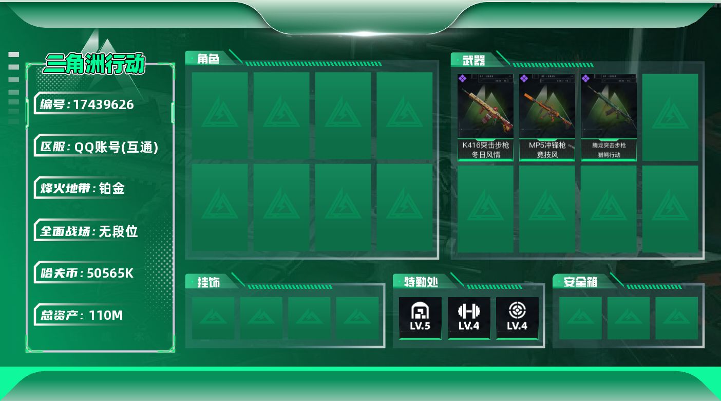 [17439626]【特价出售/店主推荐】110m总资产-50565k哈伏币-40烽火等级-铂金-1战场等级-无军衔 【近战皮肤】:近战-黑鹰 【史诗外观】:K416突击步枪-冬日风情,腾龙突击步枪-猎鳄行动,MP5冲锋枪-竞技风 【稀有外观】:AKM突击步枪-肃杀,SG552突击步枪-2026,Vector冲锋枪-先锋,SMG-45-行动开启,勇士冲锋枪-冰天雪地,Mini-14射手步枪-荣耀列队 【普通外观】:M4A1突击步枪-高雅黑,QBZ95-1突击步枪-海浪,K416突击步枪-高雅黑,M16A4突击步枪-高雅黑,AUG突击步枪-浅蓝涂装,SG552突击步枪-海浪,SCAR-H战斗步枪-数码迷彩,UZI冲锋枪-海色,野牛冲锋枪-高雅黑,SVD狙击步枪-高雅黑 【载具外观】:M1A4坦克-驯鹿 【挂饰】:挂饰-赤霄游龙,挂饰-崩岩重炮*3,挂饰-暗行哨兵*7,挂饰-紧急撤离*23