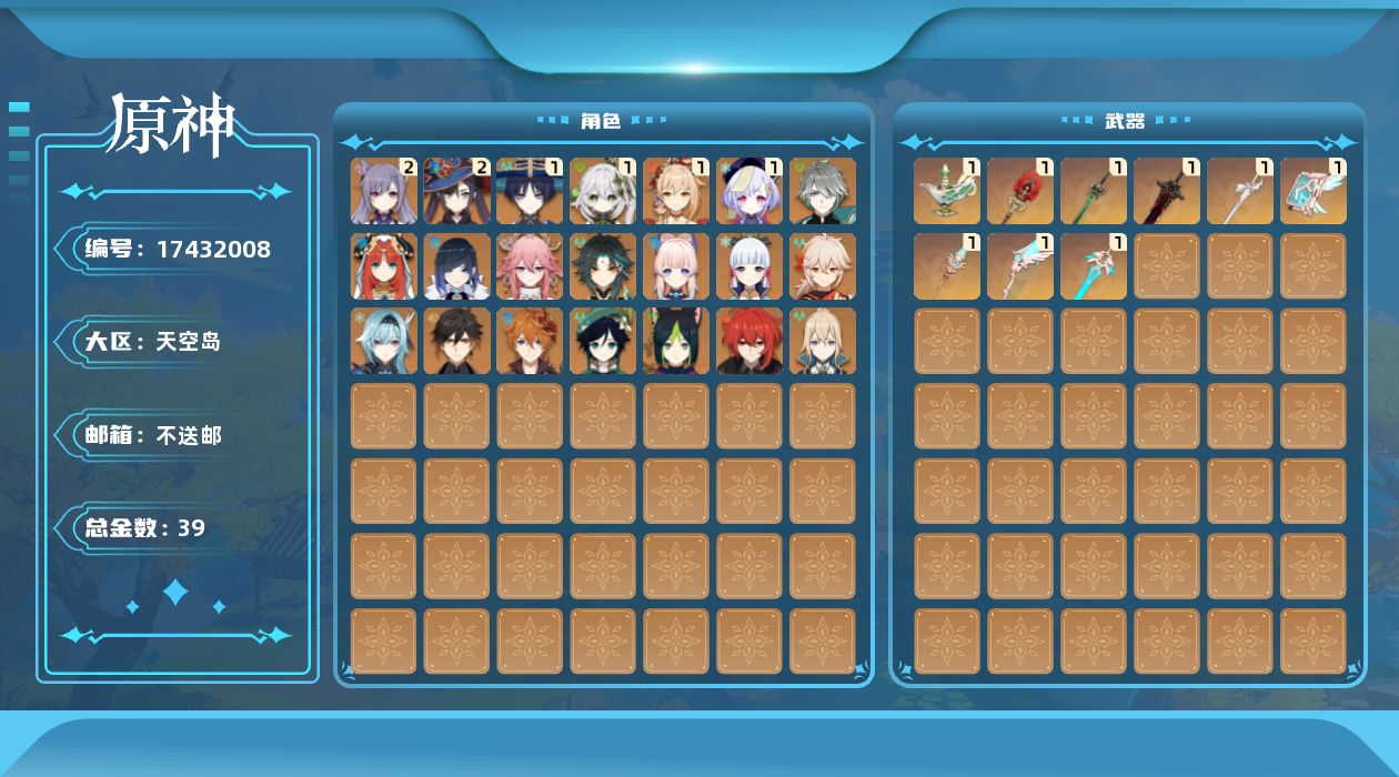 0命艾尔海森,1命流浪者,1命纳西妲,0命妮露,0命提纳里,0命夜兰,0命八重神子,0命优菈,0命枫原万叶,0命神里绫华,0命钟离,0命魈,1命宵宫,0命温迪,0命达达利亚,0命珊瑚宫心海,2命刻晴,1命七七,0命琴,2命莫娜,0命迪卢克,精1千夜浮梦,精1护摩之杖,精1磐岩结绿,精1天空之脊,精1天空之翼,精1天空之刃,精1天空之卷,精1风鹰剑,精1狼的末路