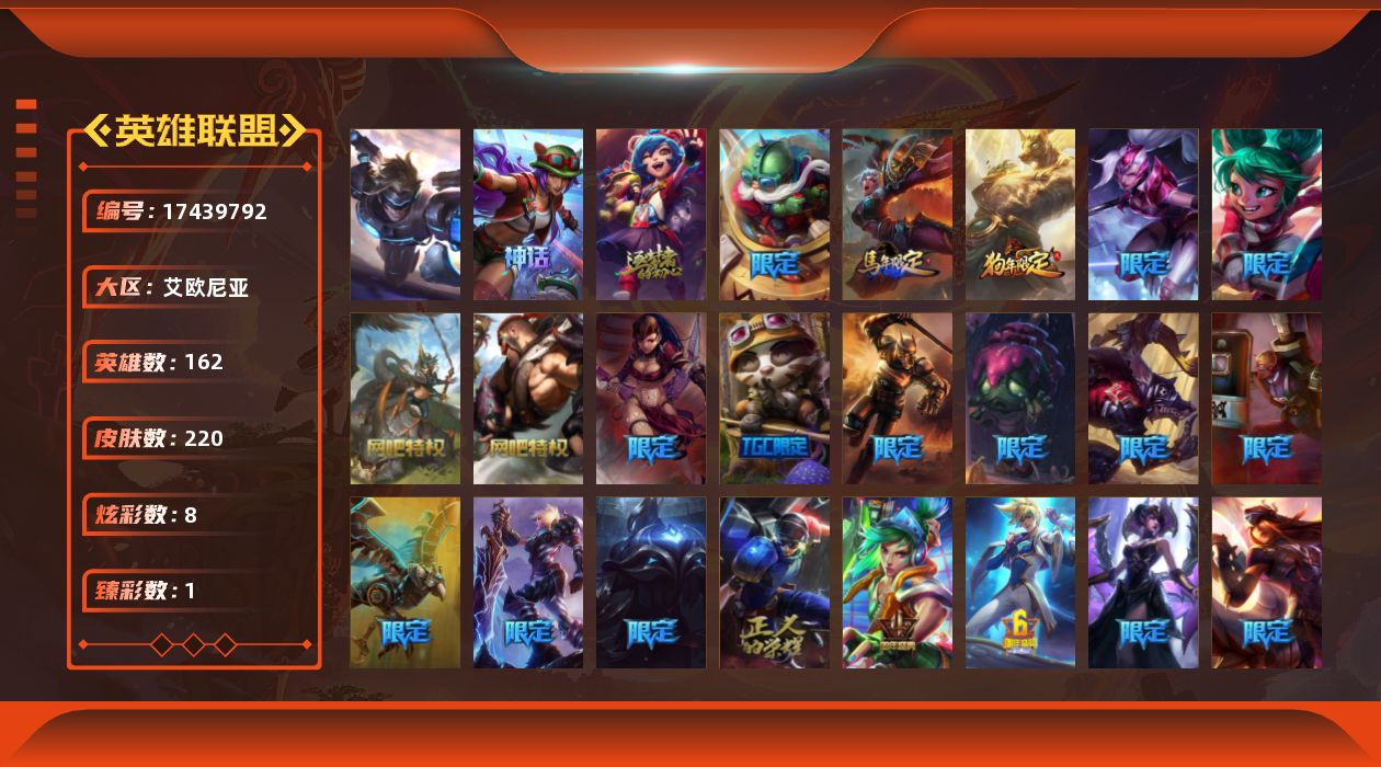 [17439792]未定级段位-162英雄-220皮肤-8炫彩-1终极-2神话-61限定-24传说-52史诗