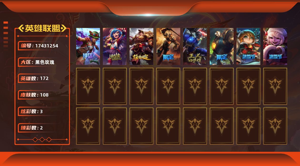 [17431254]【店主推荐捡漏号】未定级段位-172英雄-108皮肤-3炫彩-0终极-3神话-6限定-12传说-22史诗