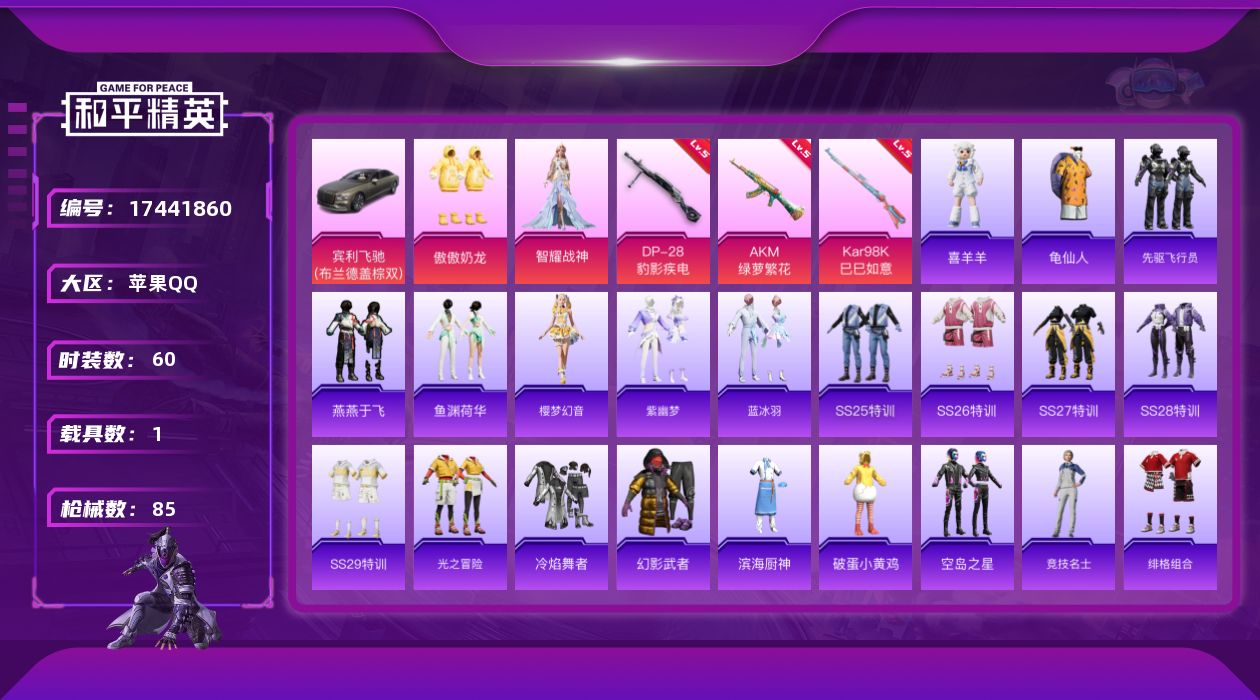 [17441860]苹果 手Q-2粉装-3特效枪-1载具-1粉色飞行器-24908热力值-3王牌印记-60套装-85枪皮 【热门品类】:套装-龟仙人 【粉色套装】:粉装-傲傲奶龙,角色-智耀战神 【粉色枪皮等级】:AKM-绿萝繁花(五级),Kar98K-巳巳如意(五级),DP-28-豹影疾电(五级) 【粉色载具】:宾利飞驰(布罗德盖棕双色) 【粉色枪皮】:AKM-绿萝繁花,Kar98K-巳巳如意,DP-28-豹影疾电 【粉色飞行器】:炫彩糖果飞行器 【粉色降落伞】:极限特训降落伞,环太平洋降落伞,闲梦青缨降落伞,创世·救赎降落伞,炫彩糖果降落伞 【稀有套装】:套装-龟仙人,套装-炫彩糖果,套装-先驱飞行员,套装-燕燕于飞,套装-鱼渊荷华,套装-樱梦幻音,套装-紫幽梦,套装-蓝冰羽,玩偶服-喜羊羊 【稀有枪皮】:AKM-龙的传人,M16A4-莲影清波,SCAR-L-炫彩节奏,M416-糯团青竹,M416-蓝色火焰,M762-天降萌叽,M762-牛气冲天,AC-VAL-快闪甜心,蜜獾-天降萌叽,UZI-啾咪啾咪,UZI-天降萌叽,Vector-生命誓言,汤姆逊-天降萌叽,汤姆逊-环太平洋,汤姆逊-智耀战神,P90-快闪甜心,Kar98K-彩虹符号,Kar98K-星穹咏叹调,AWM-圣堂之誓,SKS-心之恋语,SKS-炫彩节奏,M417-惊鸿侠骨,MK20-H-快闪甜心,MK20-H-樱桃泡泡,M200-惊鸿侠骨,S12K-玩趣呆呆,M249-彩虹符号,DP-28-彩虹符号,MG3-幻世战舞者,MG3-惊鸿侠骨,P18C-镜光幻境,沙漠之鹰-快闪甜心,爆炸猎弓-惊鸿侠骨 【其他套装】:套装-SS25特训,套装-SS26特训,套装-SS27特训,套装-SS28特训,套装-SS29特训,套装-光之冒险,套装-冷焰舞者,套装-幻影武者,套装-滨海厨神,套装-破蛋小黄鸡,套装-空岛之星,套装-竞技名士,套装-绯格组合,套装-血色贵族,套装-长空猛禽,套装-雨林探路者,套装-霓虹街区,套装-霓虹闪烁,套装-魅力单车,套装-黄色名流,套装-黑色伏地魔,套装-龙的传人,套装-龟仙人,套装-特战英豪,套装-沙漠毒蛇,套装-漫步者,套装-甜蜜菠萝,套装-惊鸿侠骨,套装-锦衣飞扬,套装-晨曦薄雾,套装-快闪甜心,套装-春光漫游,套装-贝斯之夜,角色-情公主 【营地ID】:900566575