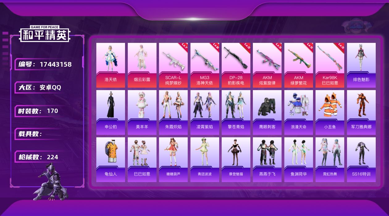 [17443158]安卓 手Q-2粉装-8特效枪-0载具-3粉色飞行器-68531热力值-19王牌印记-170套装-224枪皮 【热门品类】:套装-浪漫天命,套装-小丑鱼,角色-军刀雅典娜,套装-龟仙人 【粉色套装】:角色-洛天依,角色-烟云彩露 【粉色枪皮等级】:AKM-炫紫旋律(五级),AKM-绿萝繁花(五级),SCAR-L-纯梦嫁纱(七级),Kar98K-巳巳如意(五级),Mk14-福马献瑞(三级),DP-28-豹影疾电(五级),MG3-洛神天依(六级),PKM-萌骑夺宝(五级) 【粉色枪皮】:AKM-炫紫旋律,AKM-绿萝繁花,SCAR-L-纯梦嫁纱,Kar98K-巳巳如意,Mk14-福马献瑞,DP-28-豹影疾电,MG3-洛神天依,PKM-萌骑夺宝 【粉色飞行器】:天之羽翼飞行器,萌物绒绒飞行器,极意拳锋飞行器 【粉色降落伞】:幻影战神降落伞,洛神天依降落伞,暗夜鎏金降落伞,未来歌姬降落伞,炫光之旅降落伞,圣堂之誓降落伞,江南烟雨降落伞,幻彩电音降落伞,炫彩糖果降落伞 【稀有套装】:套装-龟仙人,套装-巳巳如意,套装-马上有钱,套装-糖糖葫芦,套装-青团波波,角色-摩登魅猫,套装-燕燕于飞,套装-鱼渊荷华,套装-霓虹热舞,套装-朱霞炽焰,套装-凌霄紫焰,套装-擎苍青焰,玩偶服-美羊羊,角色-申公豹,角色-绯色魅影 【稀有枪皮】:AKM-冰凉西瓜,AKM-夜灯,AKM-彩虹符号,AKM-江南烟雨,AKM-灼热熔岩,AKM-破晓战魂,AKM-缤纷海域,AKM-萌趣颜团子,AKM-虎虎生威,AKM-霓虹街区,AKM-龙的传人,M16A4-幻世战舞者,M16A4-甜心亚梦,SCAR-L-夜灯,SCAR-L-炫彩节奏,SCAR-L-玉兔迎春,SCAR-L-红色方程式,SCAR-L-小狗蛇点点,M416-动感兔斯基,M416-夜灯,M416-糯团青竹,M416-红色方程式,M416-绯红前夜,M416-蓝色火焰,GROZA-异彩先驱,GROZA-懵萌河马,GROZA-田园牧歌,AUG-天降萌叽,AUG-耀粉歌者,QBZ-未来歌姬,QBZ-洛神天依,QBZ-飞驰魅影,M762-天降萌叽,M762-彩虹符号,M762-瑞龙福将,M762-镭射皇者,Mk47-妙红点点,Mk47-洛神天依,G36C-懵萌河马,AC-VAL-天降萌叽,AC-VAL-彩虹甜喵,AC-VAL-甜心亚梦,蜜獾-垂柳戏