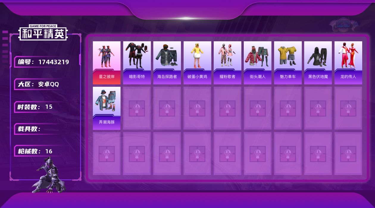 [17443219]安卓 手Q-1粉装-3特效枪-0载具-0粉色飞行器-4375热力值-2王牌印记-15套装-16枪皮 【热门品类】:套装-暗影哥特 【粉色套装】:粉装-星之彼岸 【粉色枪皮等级】:ACE32-萌骑漫游(二级),Mk14-福马献瑞(五级),信号枪-金乌曜日(一级) 【粉色枪皮】:ACE32-萌骑漫游,Mk14-福马献瑞,信号枪-金乌曜日 【稀有套装】:角色-阿虎,套装-马上有钱 【稀有枪皮】:AKM-缤纷海域,SCAR-L-夜灯,AUG-耀粉歌者,UZI-幻影战神,UMP45-夜灯,Vector-生命誓言,S12K-幻影战神,DP-28-彩虹符号 【其他套装】:套装-暗影哥特,套装-海岛探路者,套装-破蛋小黄鸡,套装-耀粉歌者,套装-街头潮人,套装-魅力单车,套装-黑色伏地魔,套装-龙的传人,套装-弄潮海豚 【稀有头盔】:幻影战神头盔(2级),幻影战神头盔(1级) 【稀有背包】:幻影战神背包(1级) 【营地ID】:1043140975